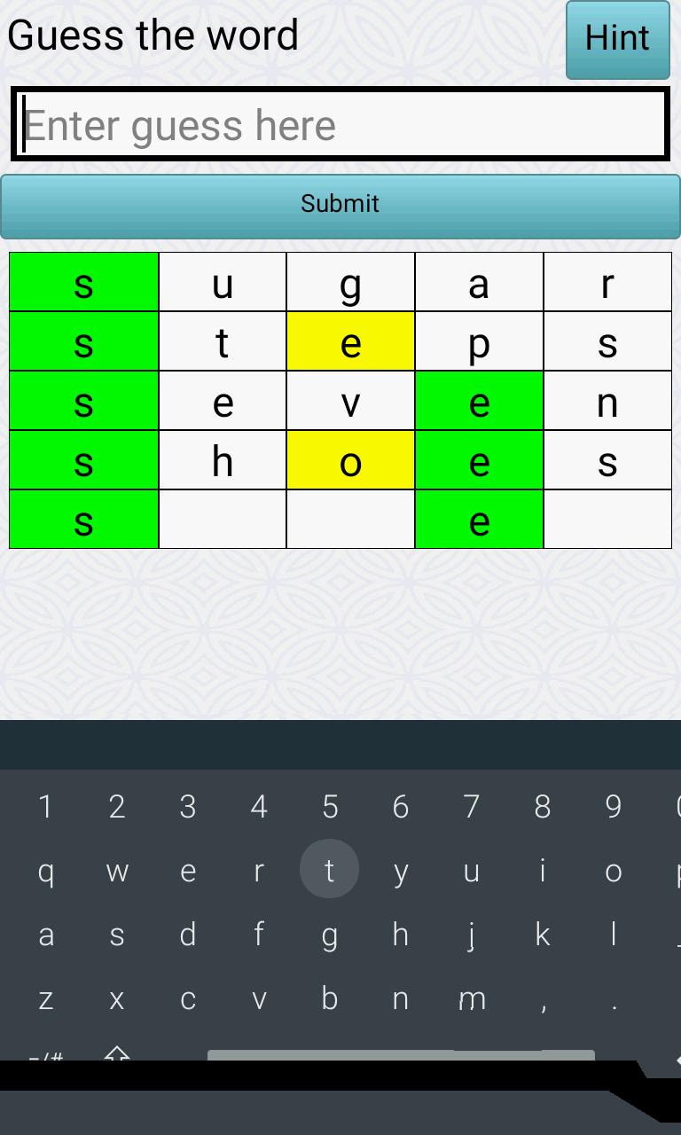 The App generates a random 5 letter word from the English dictionary and displays the first letter of the word. You have to guess the word and have 5 tries to do so. After each guess you will receive hints as follows: