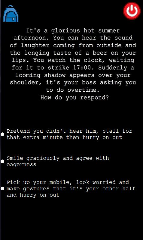 After Hours is a retro text based adventure game, full of deadly surprises!!