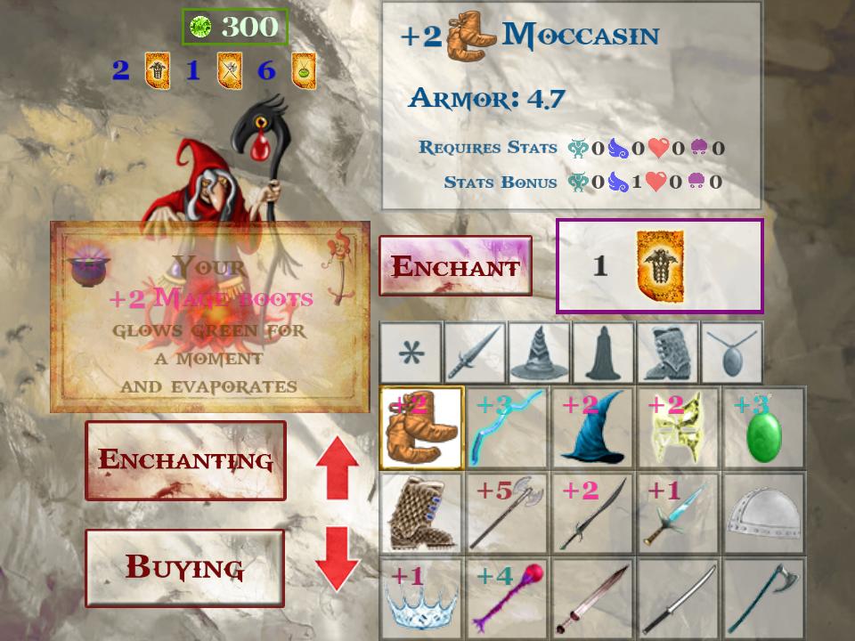 Items found in the cave can be enchanted and become immensely stronger in the process. Each time an item is enchanted there is a small chance that the item rejects the new power and is destroy, evaporating into thin air.