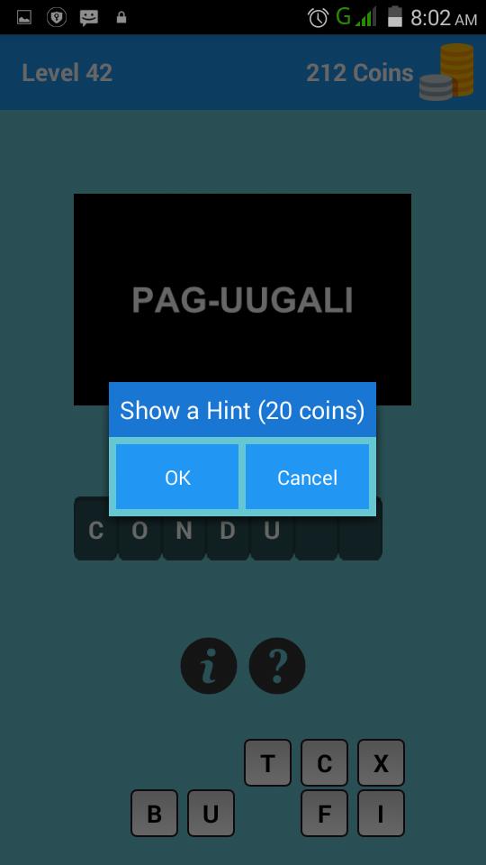 The objective of the game is to know the right English translation of the Tagalog word shown in the screen by tapping the correct letters. Should a player get stuck, there is a hint and reveal a letter buttons for you, but it will cost coins. Although there are words which are obvious enough you need to know that a particular word has synonyms, and the game is looking for that particular word even thou you have in your mind a right word which doesn't fits the answer. All in all it is a very educational, fun and challenging game, that you want to share to others.