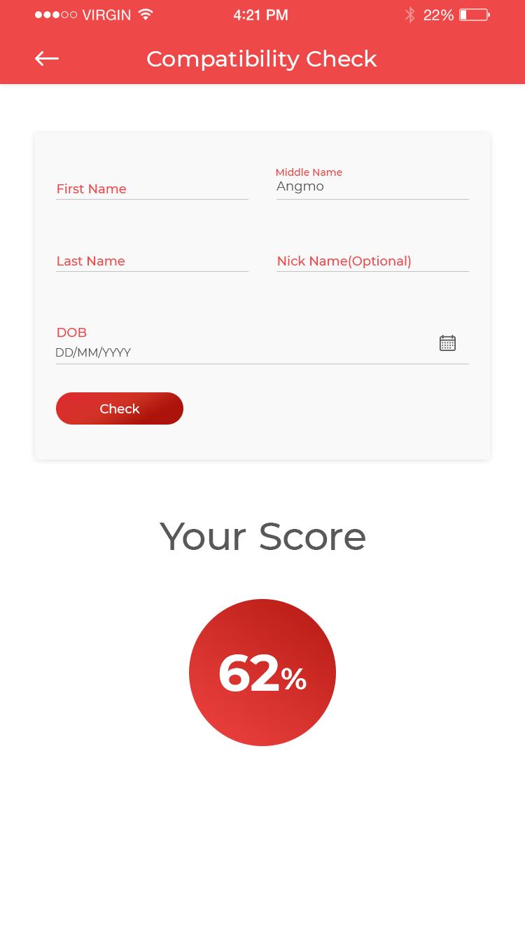 يوفر هذا التطبيق أعضائه من الوقت والمال لأنه يربط المستخدمين الذين يتوافقون بنسبة 56 ٪ أو أكبر مع بعضهم البعض ، والذين يعيشون على بعد 1000 كم أو أقرب عند الاختيار في الإعدادات. خلال رحلاتك ، قد يتم إخطارك بالمباريات المتوافقة المحيطة بموقعك. من أجل الدقة ، إذا كان لديك أكثر من اسم متوسط ، فيرجى إضافتها جميعًا بدون مسافات بينهما. قبل الذعر ، يتمتع الأشخاص المشهورون بأسمائهم الكاملة و DOB عبر الإنترنت ، ليس لدينا اهتمام بتفاصيلك الشخصية باستثناء أغراض التوافق والأمان.
