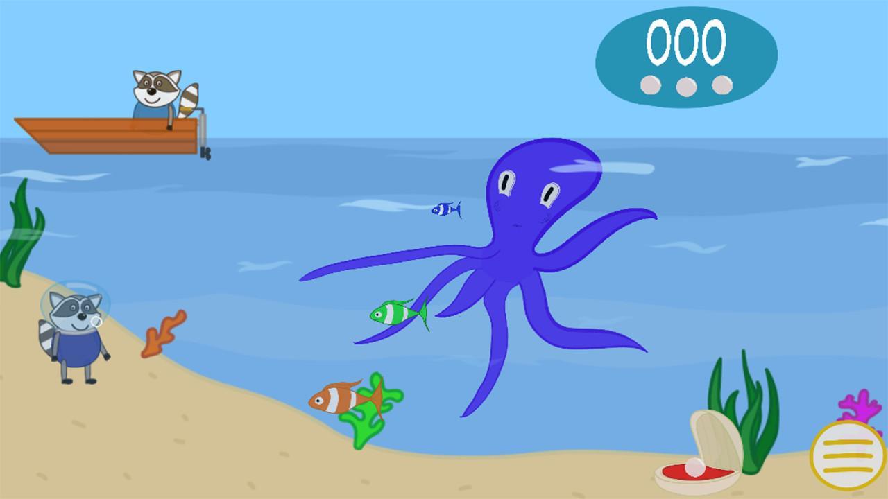 Baby Hippo has a lot of friends. This game is about raccoons, who went treasure. At the bottom of the ocean is home to many marine animals and colorful fish. And of course there are the treasures that are protected by an octopus. Your task is to go down into the water to get to the pearls, take one pearl and back to the boat. Try not to octopus hooked you. For every pearl you lift the boat, you get 1 point. This mini game is difficult the first in which it is necessary to gather the harvest on the farm and will be interesting for older children.