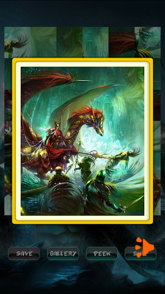 Enjoy of high quality images. The game contains 60 levels with beautiful warriors pictures. You will find sword, weapons, dragon, knight, armor and knight's battles. Drag the pieces to the right place to create the image. Use "Peek" button to preview the original image. Completed levels will be unlocked and you can save images to SD-card. If you can not complete any level you can simple skip it and try to complete it later. Just press "Skip" level button to skip current level.