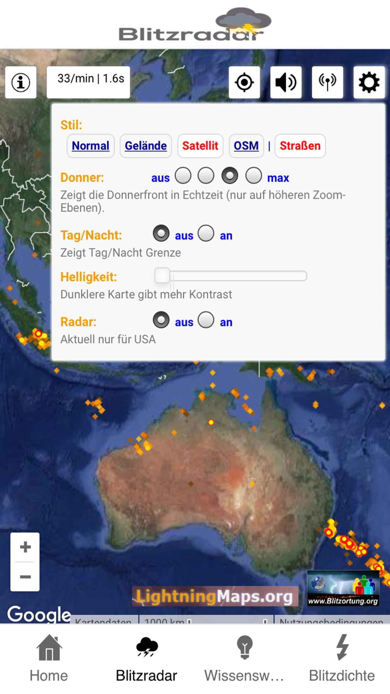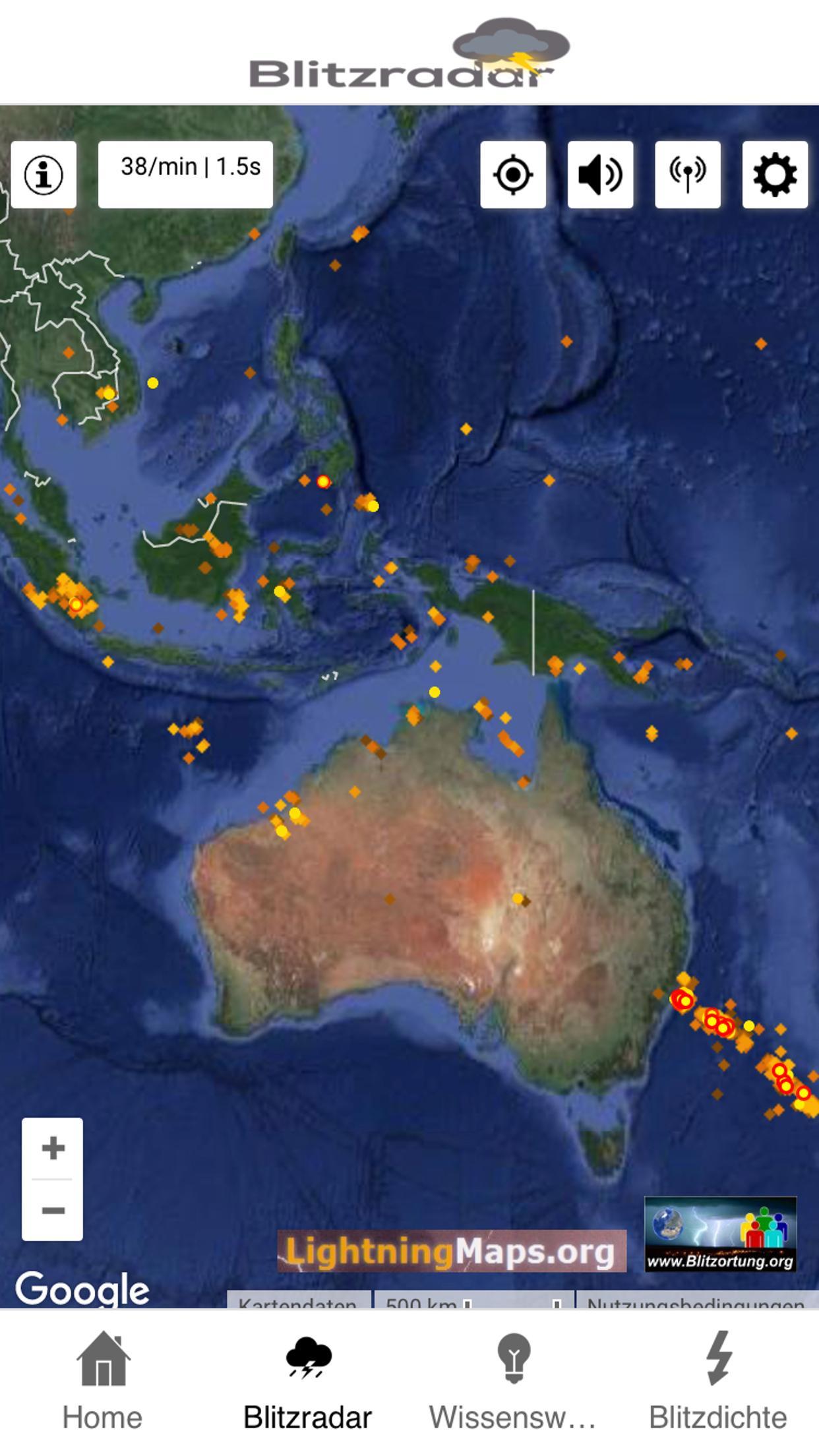 You will be displayed in real time flashes on the map. The darker the color coding of the individual flashes, the higher the thunderstorm activity. It can be seen back up to 24 hours where most storm clouds existed. The card can be operated with two fingers with which you can zoom and move.