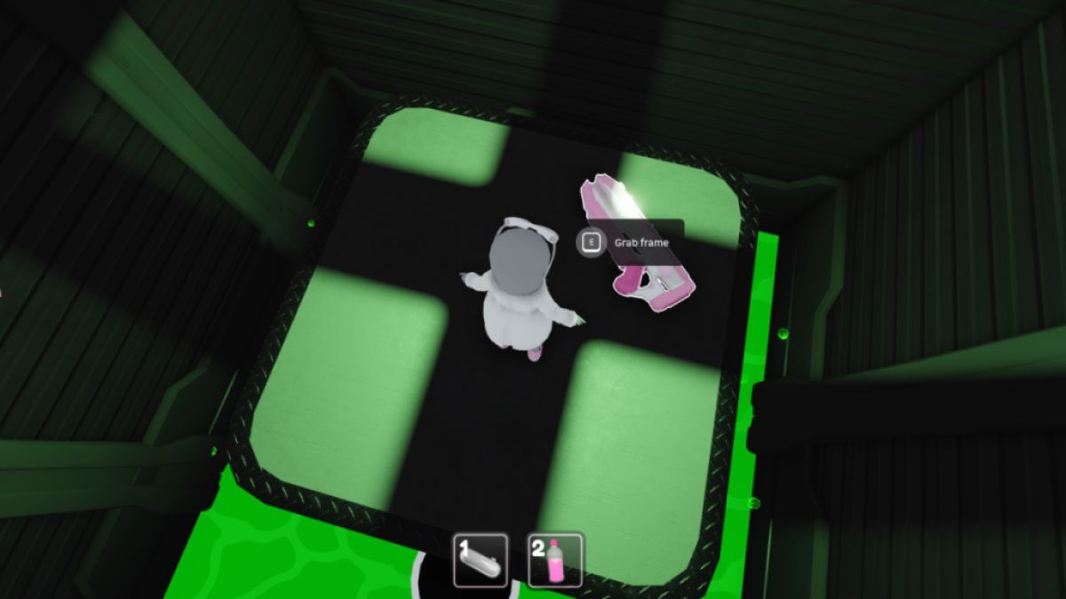 Now, go and use the Keycard on the smaller door to the left of the double doors. Here you'll have to complete an obby. When your reach the three colored planks, to decide which one is the real one, try to move your camera through it. If it goes through, it's fake, if it starts clipping and bugging, then it's real. Use the trampoline to get up and grab the Gun Frame. Assemble the gun and make your way back to the lab.