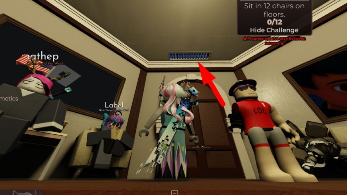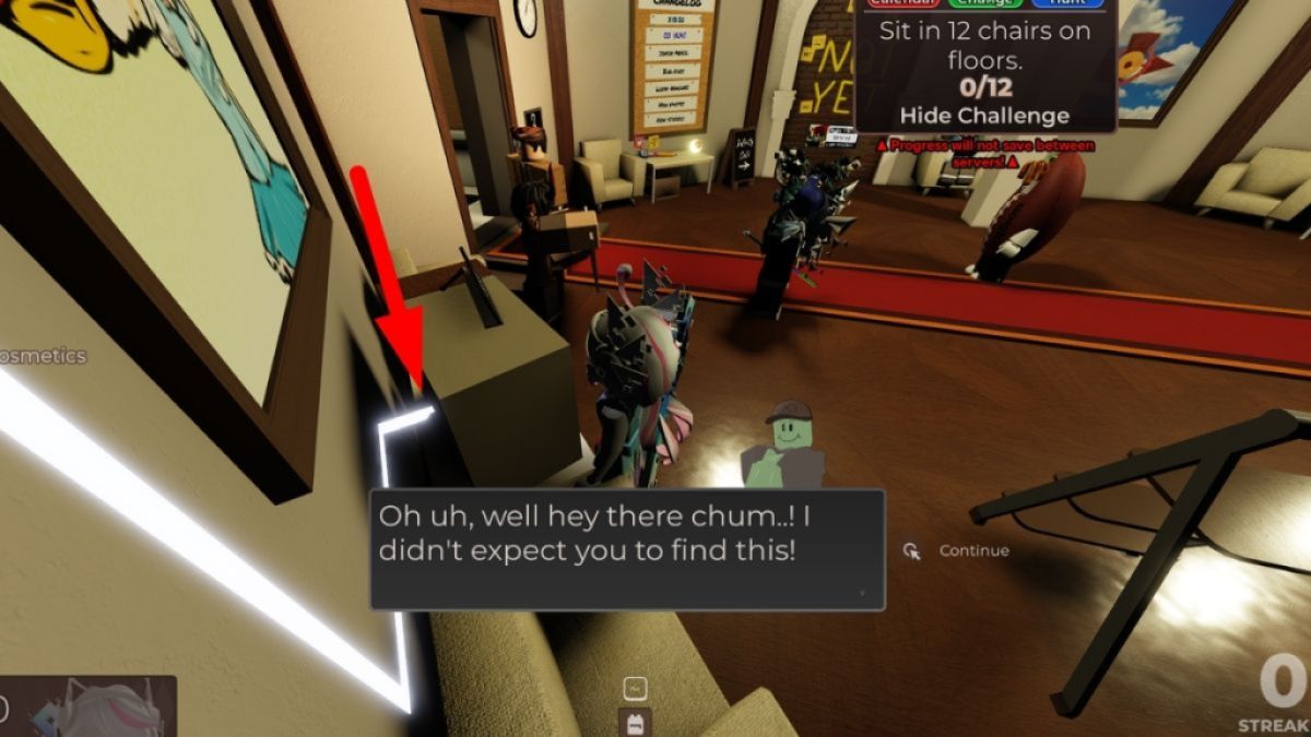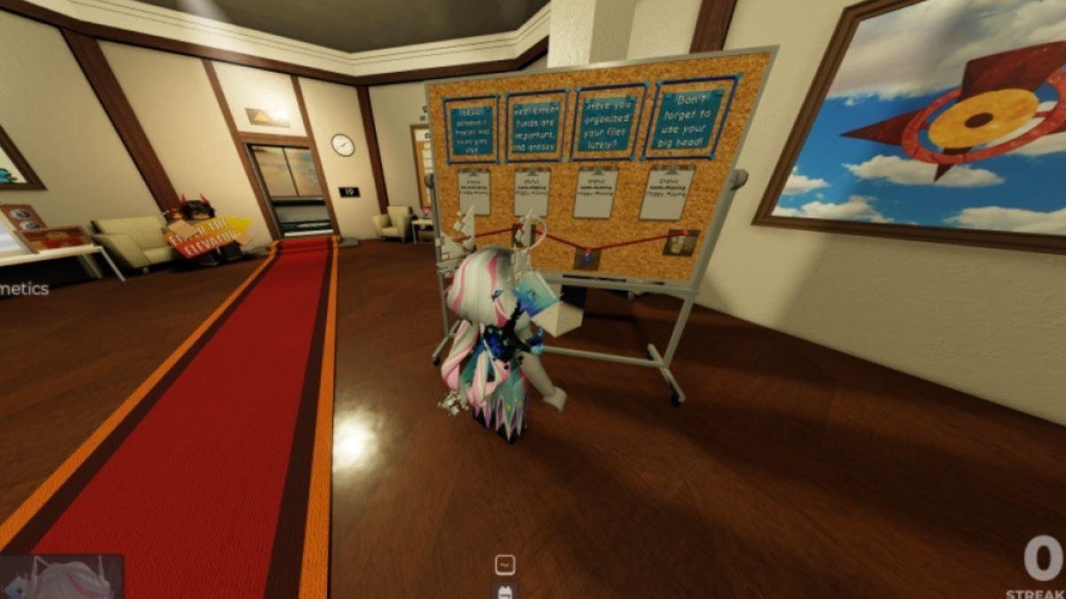 To start the Hunt Mega Token Quest in Regretevator, get the other Mega Tokens first, then go into the Lobby. Look behind the TV and you'll see a little white button. Press it to officially start the quest. There is a blue vent above the spawn door. You can go up it and you'll see a locked box. We need to find a code for it.