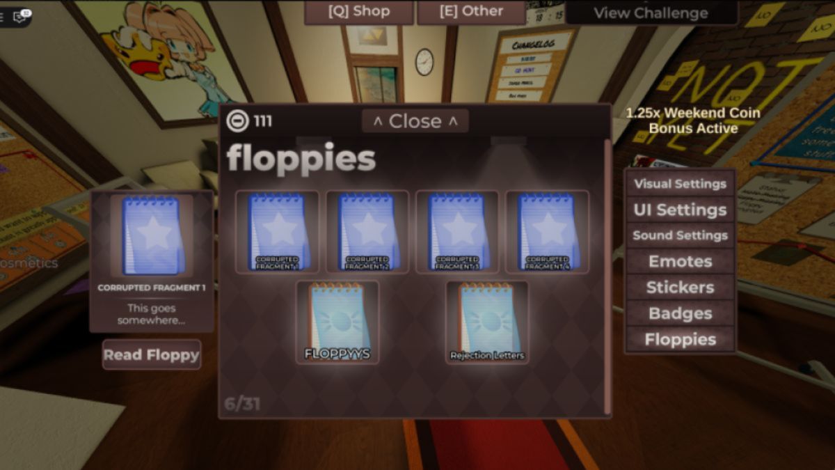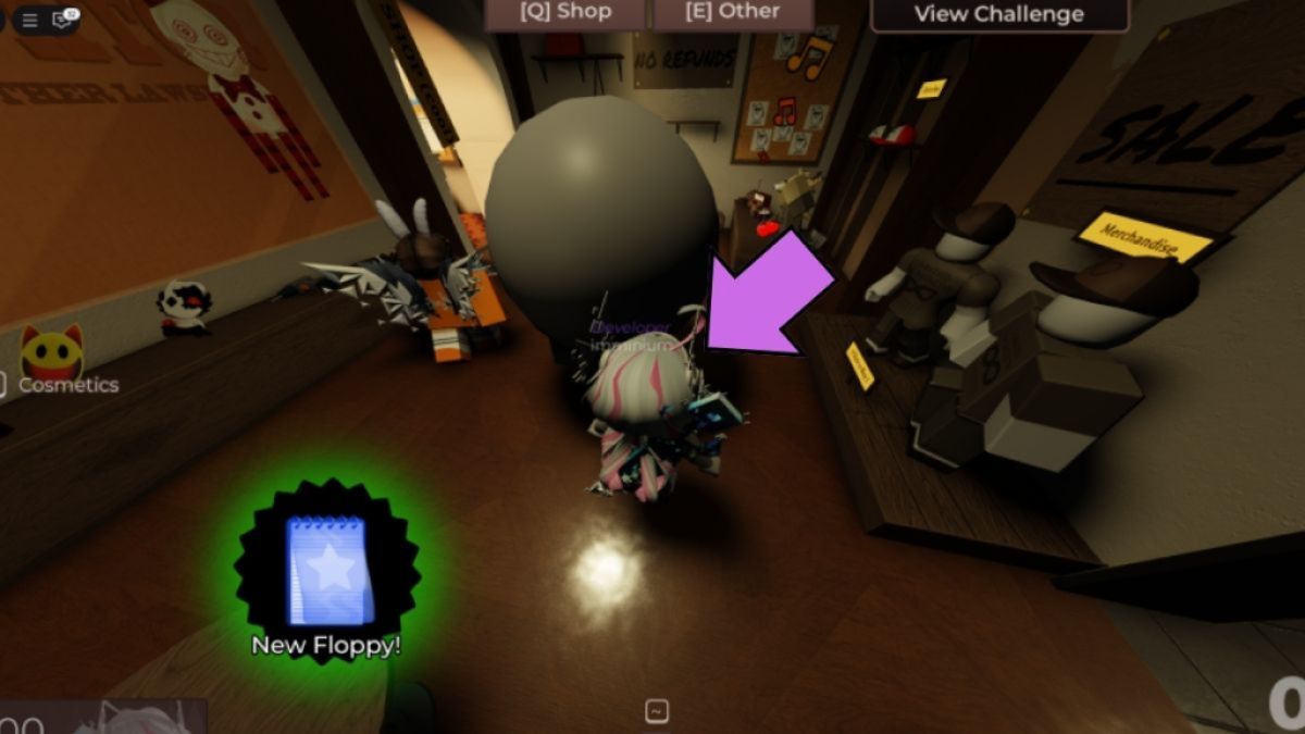 Once you have all four notes, go back to the lobby where you will see the corkscrew board. The four notes are pinned as well as four pieces of paper which tell you that you need to find Floppies. Luckily, they are all in the lobby so you don't risk dying.
