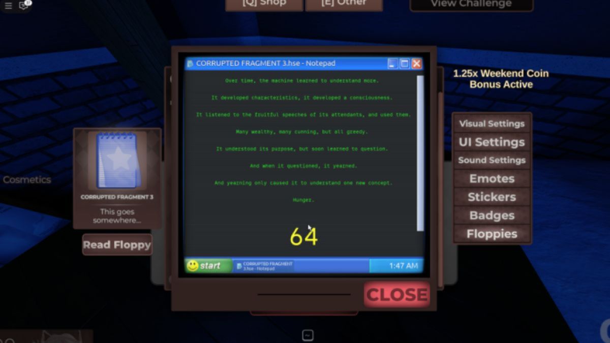 When all of the Floppies are decrypted, you can go back up the Vent and to the box. Open the menu and go back to the Floppies tab. Read each one for a two digit number which you will combine into a code. Use it and you'll get the Regretevator Mega Token.