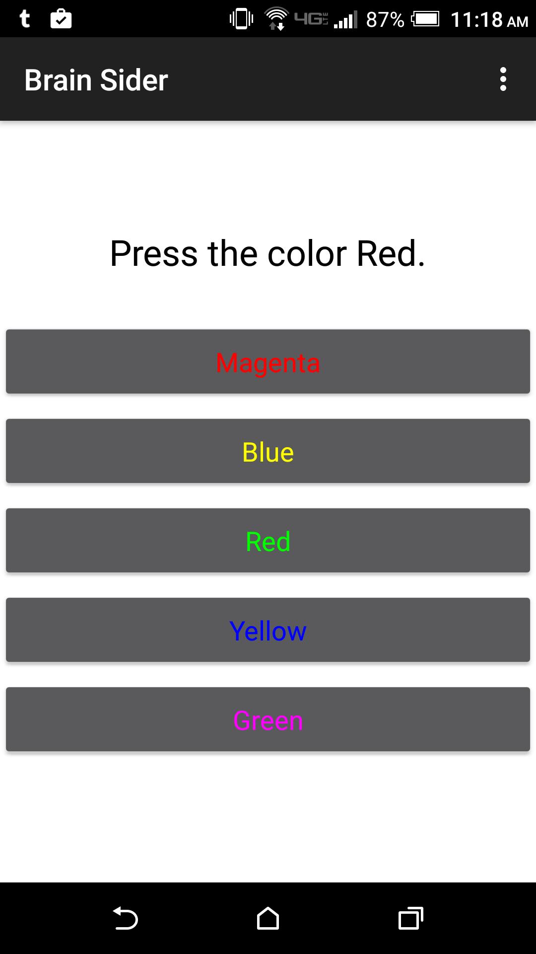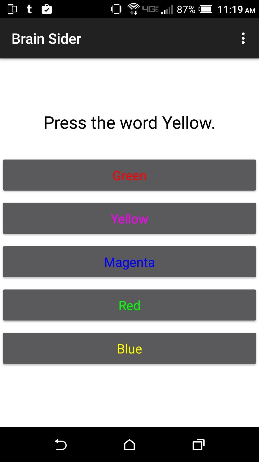 Brain Sider is a game that asks you a series of questions and then gives you feedback based on your responses. Studies show that the right side of the brain triggers creative thinking and the left side of the brain triggers logical thinking. In Brain Sider, a color will supposedly trigger the right side of your brain and a word will supposedly trigger the left side of your brain.