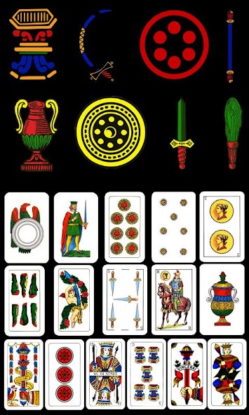 Rank and point value of cards: Ace 11pts, Three 10pts, King 4pts, Woman (or Queen) 3pts, Knave (or Horse, or Jack) 2pts