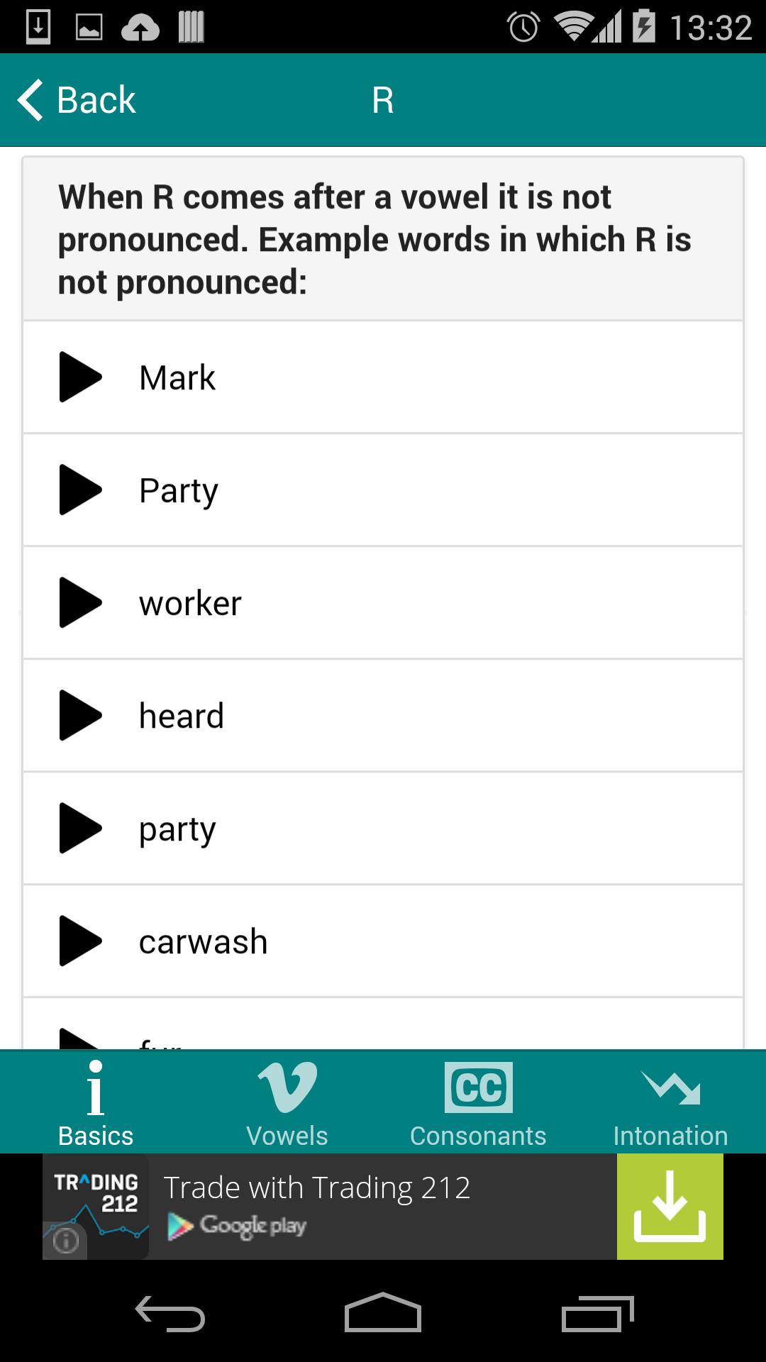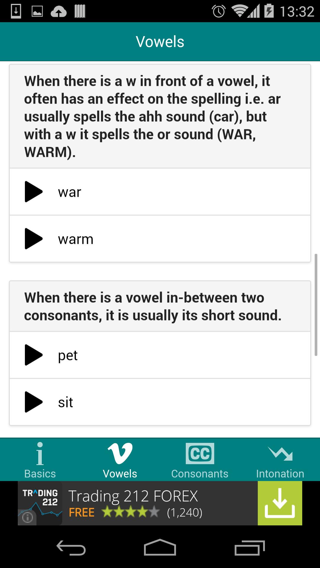British English Accent Top Tips app is quick reference to master your British English accent. This app takes you directly to the key sounds which will improve your accent in matter of minutes. This app has four sections i.e. Basics, Vowels, Consonants, and Intonation. Although with easy navigation of this app, you can jump directly to your focused sounds, we recommend that you first start with the basics section.