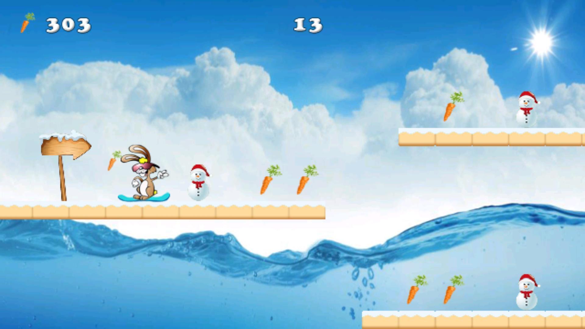 World 1 : Adventure on Iceland. Help rabbit skier on the snow to avoid the snowman with scarf red. the game becomes more complicated and you should be cautious.