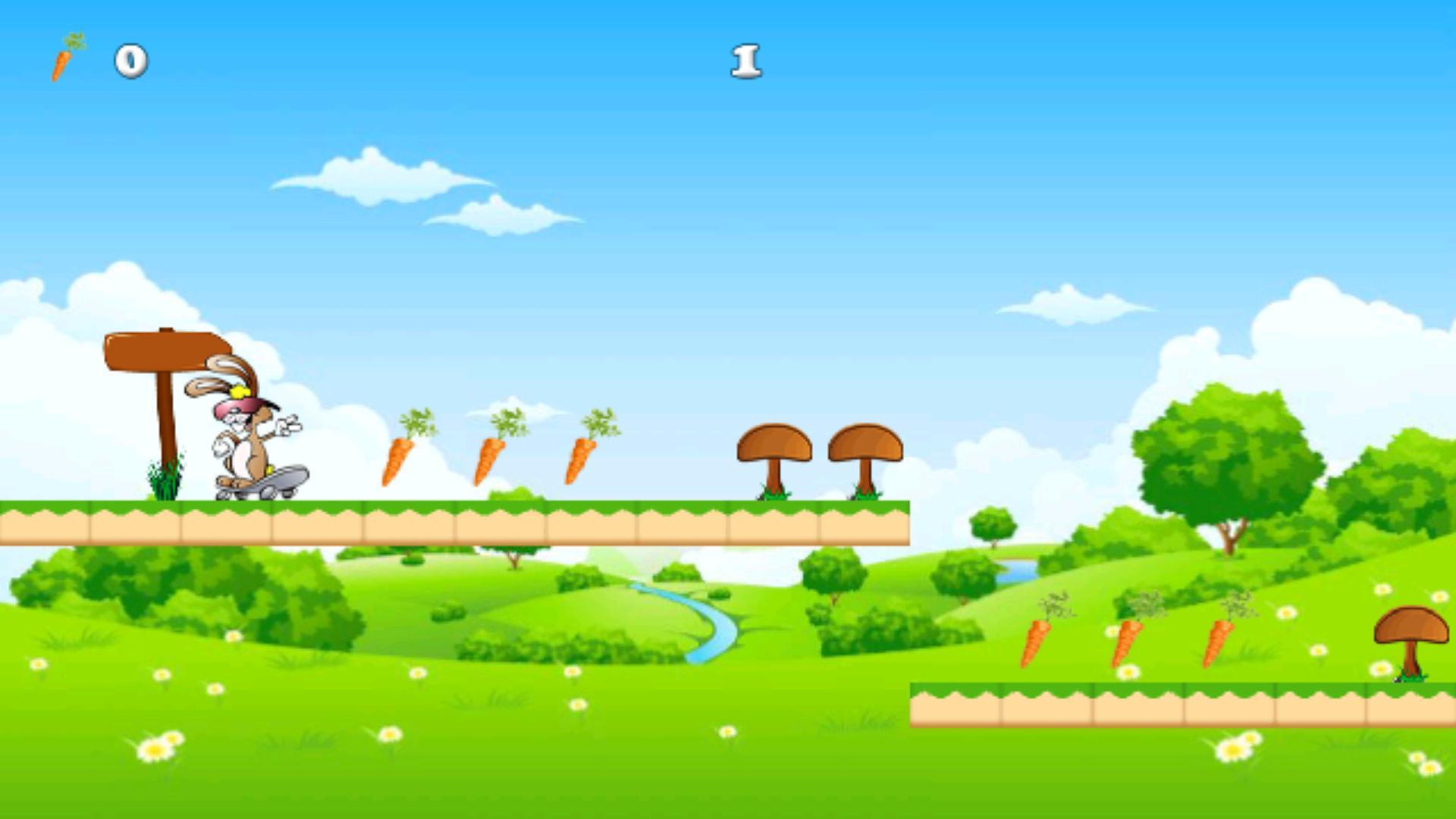 World 2 : The trip will start in the jungle. Follow the wooden directional signs for to know the path. Tap screen to let the rabbit jump in the sky and dodge wood tablet. You should get maximum of carrots.