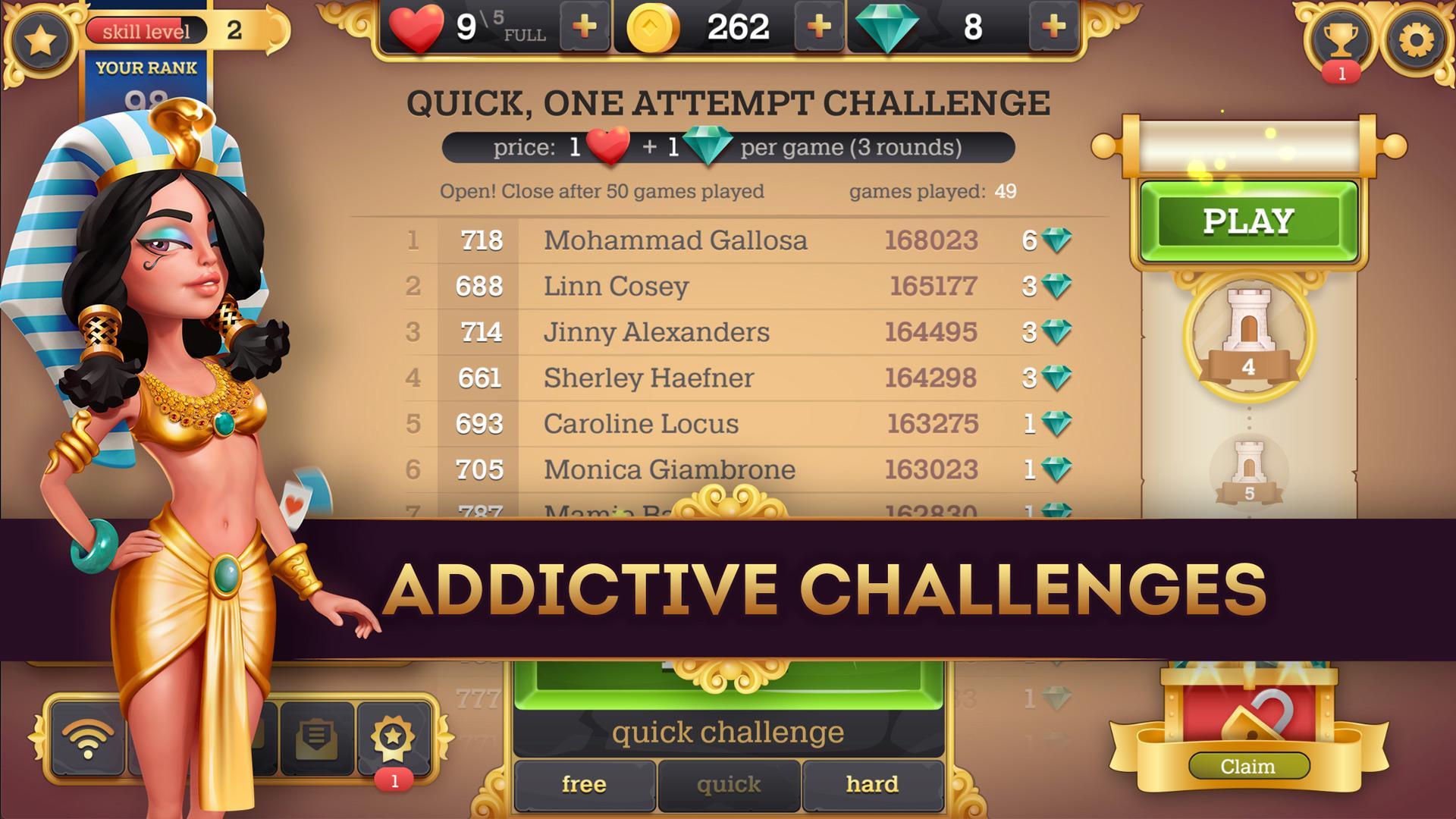 Neu in Kartenspielen? Keine Sorge! Cleopatra Solitaire TriPeaks ist anfängerfreundlich und bietet eine schnelle und einfache Einführung, um Sie in kürzester Zeit zu einem Kartenmeister zu machen. Unser Spiel ist lässig und völlig kostenlos! Worauf warten Sie noch?