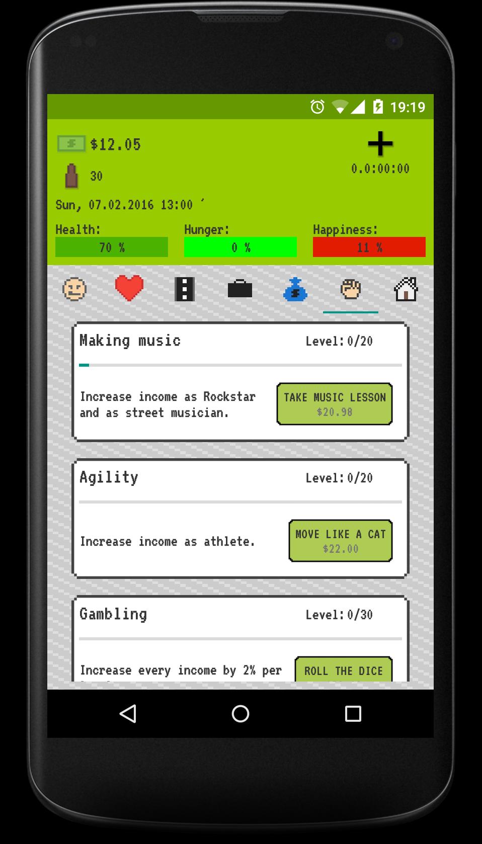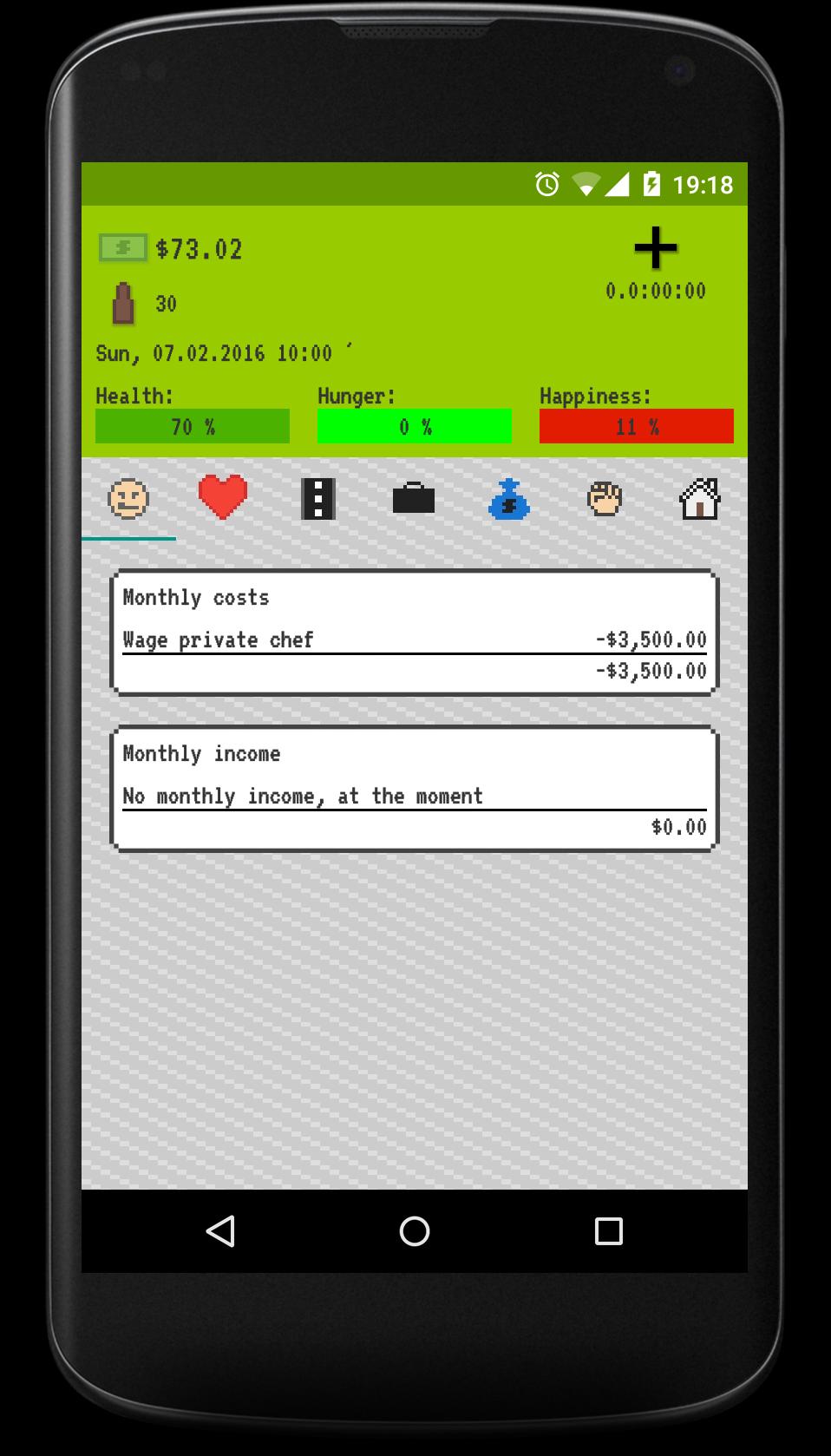 Im ersten Teil ist es Ihr Hauptziel, zu überleben, und dies ist nicht einfach. Sie haben drei verschiedene Statuswerte: Gesundheit, Glück und Hunger. Geht Ihre Gesundheit auf 0% oder unten, Sie werden sterben und Ihr eigentliches Spiel ist vorbei. Ergeht Ihr Glück 0%? Sie werden Ihre Gesundheit dauerhaft beschädigen? Wenn Ihr Hunger 100%erreicht, werden Sie Ihre Gesundheit dauerhaft beschädigen. Sie sollten also alle drei Werte in der grünen Zone aufbewahren.