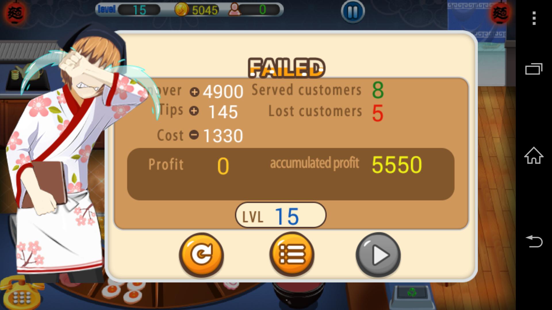 Das Spiel beginnt mit dem Kochen einiger einfacher Ramen ein paar Kunden. Wenn Sie die höheren Ebenen nach oben bewegen, müssen Sie Ramen mit mehr Belägen für mehr Kunden vorbereiten. Dann müssen Sie auch Sashimi, Sushi, Tempura, Tee und Sake rechtzeitig vorbereiten, um sie auf den Förderband zu setzen, um die Bedürfnisse der Kunden zu erfüllen. Wenn die Kunden zu lange warten, werden sie ungeduldig und verlassen das Restaurant sofort. Sie müssen den aktuellen Zielumsatz erfüllen, bevor Sie auf ein höheres Niveau wechseln. Bald werden Sie feststellen, dass es äußerst schwierig ist und sich doch süchtig danach befindet.