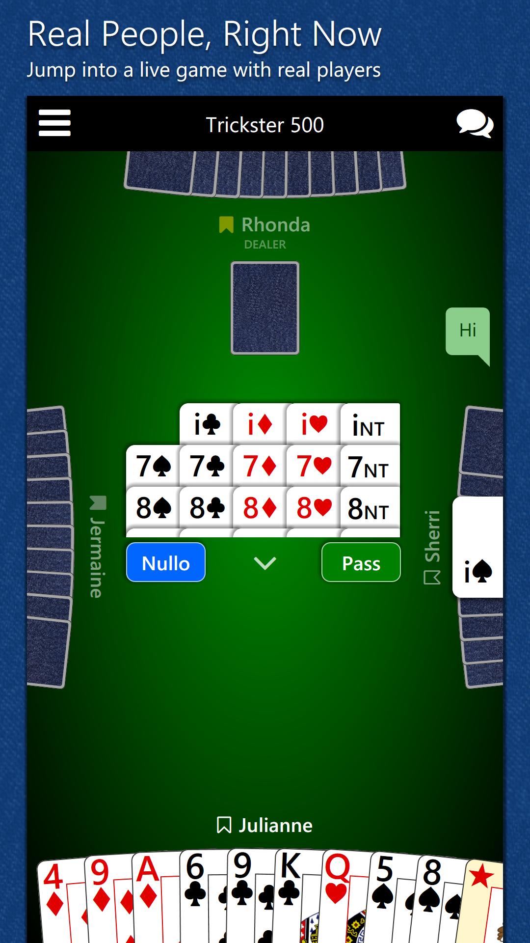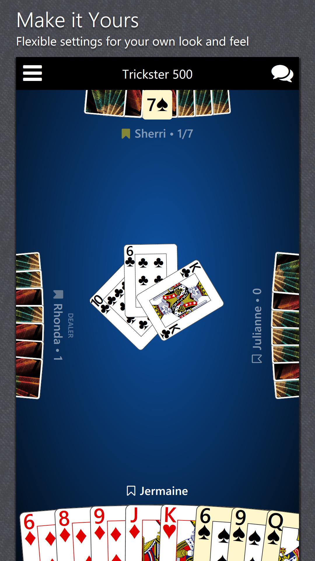 Lassen Sie den Spaß und den Wettbewerb beginnen. Spielen Sie die Spiele, die Sie mit Freunden und Familie lieben oder mit anderen Live -Spielern auf Ihrem Level abgestimmt werden. Trickster 500 bietet anpassbare Regeln, damit Sie 500 Ihren Weg spielen können!