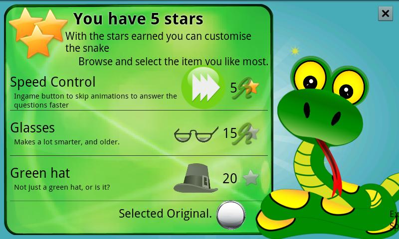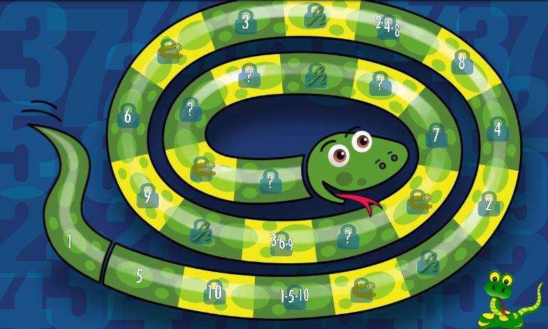 The games aim is to play all the snakes segments. Each segment has a math-division (flash-card-like play which follows a specific learning path and gets more challenging as you progress. Get awarded with 1 to 3 stars for good plays. Tap the snakes head to check out what you can do with the