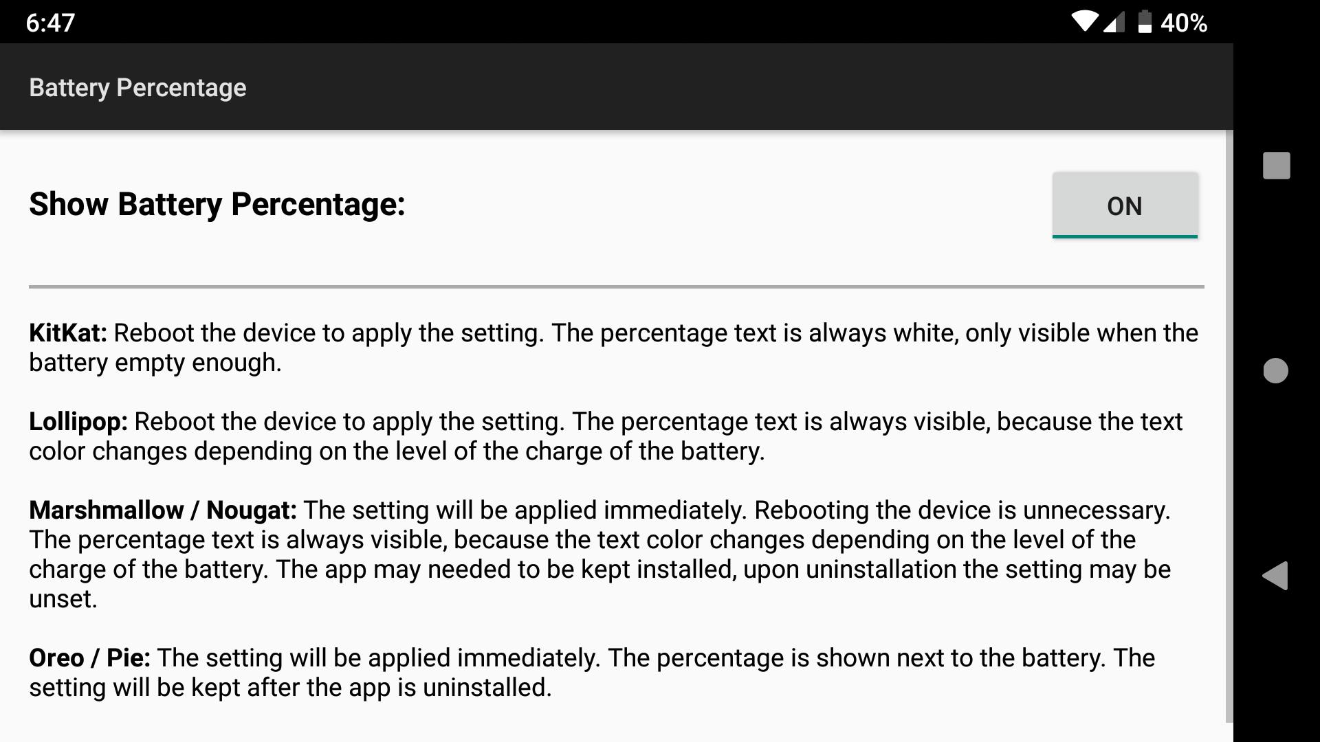 Oreo / Pie: la configuración se aplicará de inmediato. El porcentaje se muestra junto a la batería. La configuración se mantendrá después de que la aplicación esté desinstalada.