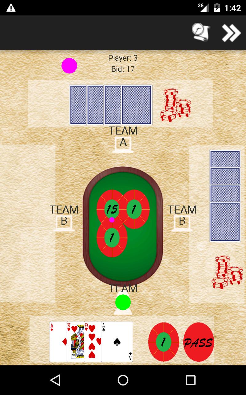 Según estas cuatro cartas, los jugadores ofertan por el derecho a elegir triunfos. Cada oferta es un número, y el mejor postor se encarga de que su lado ganará en trucos al menos el número de puntos de oferta. La persona que inicia el juego coloca la primera oferta de 15. Los jugadores posteriores, en sentido horario, pueden aumentar la oferta por 1 o pase. La subasta continúa una vez hasta que todo el jugador pase.