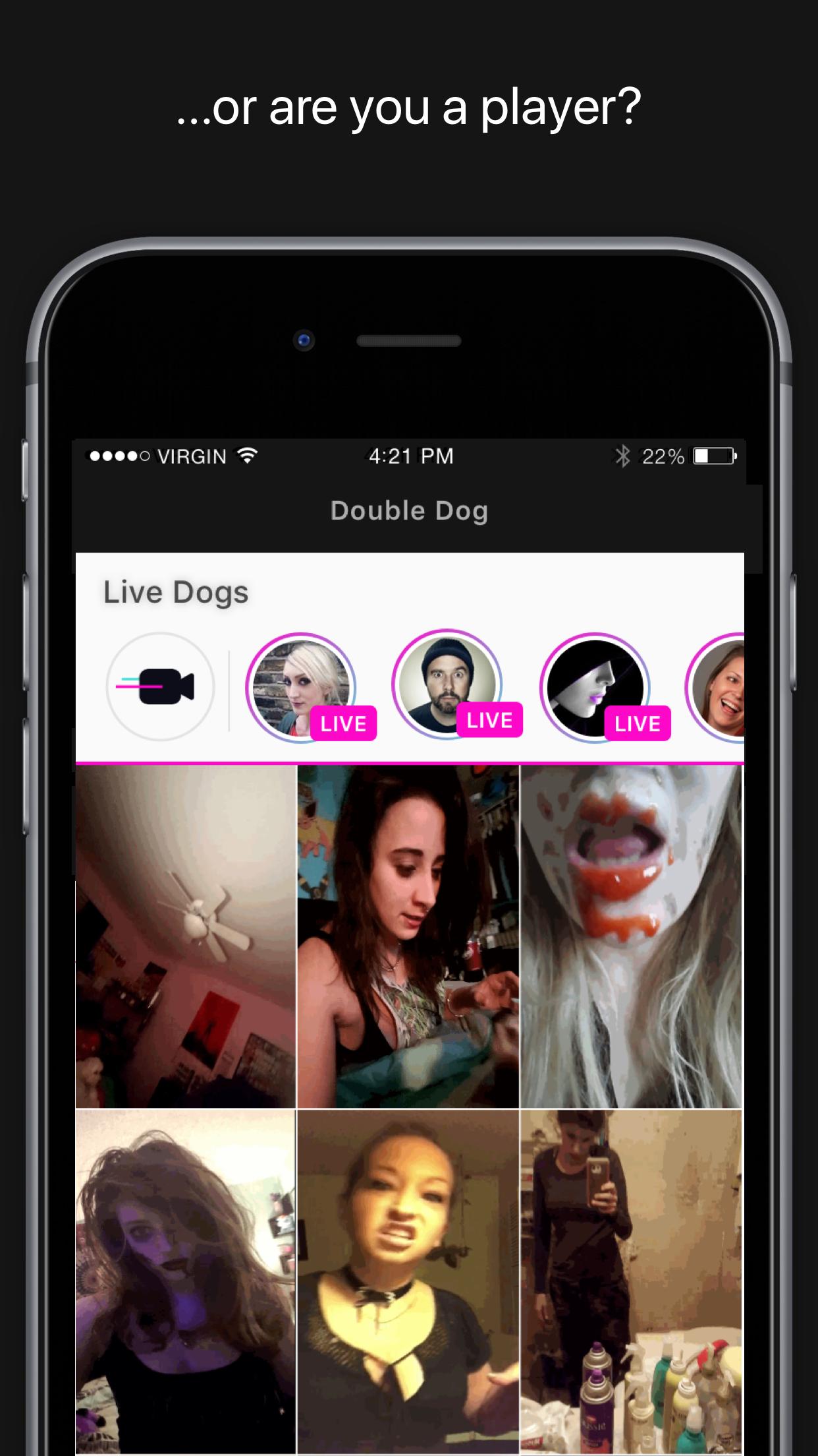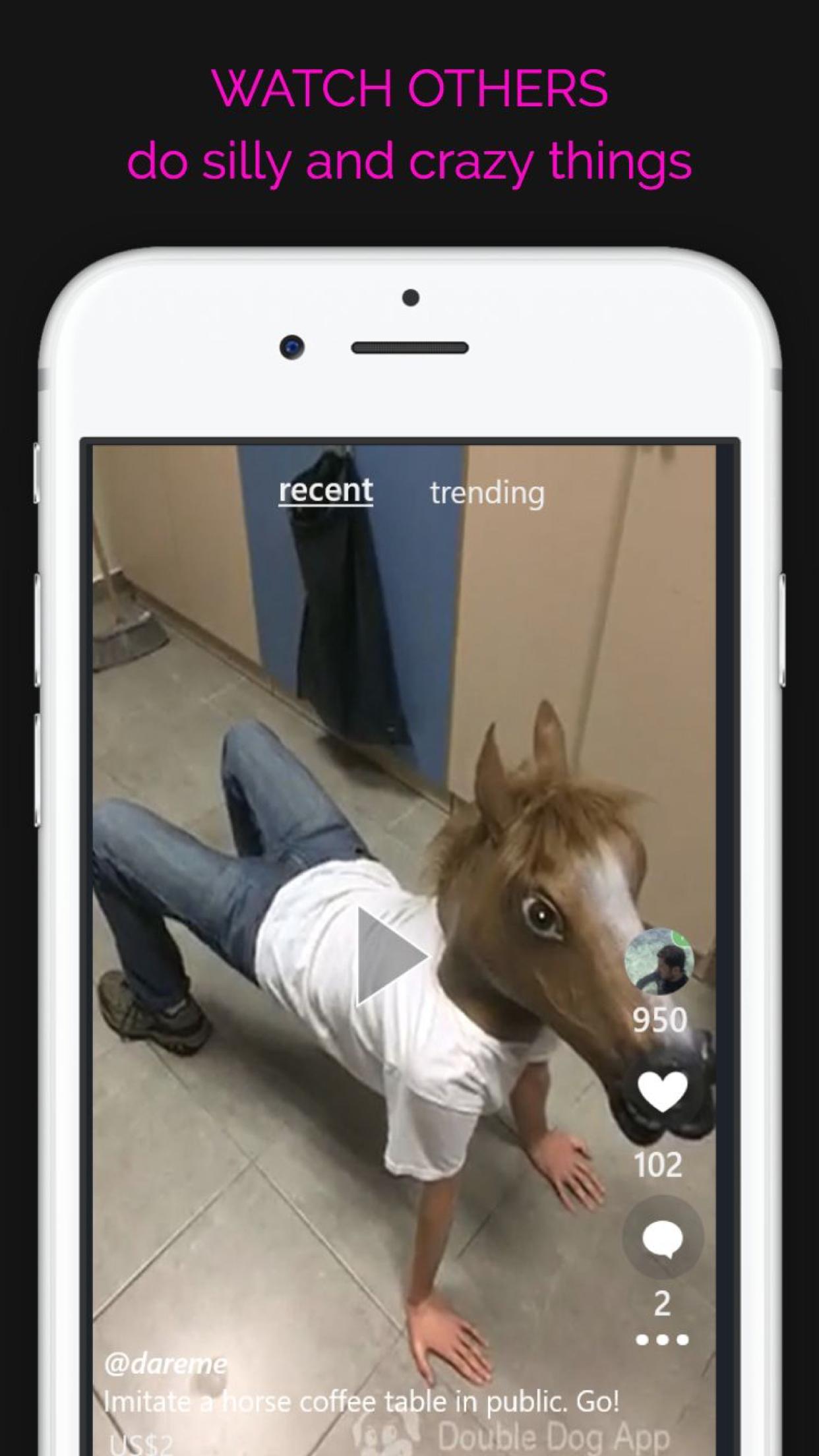 Double Dog es una aplicación Dare que puedes atrever a cualquiera que quieras. Completa Dares enviando una prueba de video, comparta sus videos de Dare y vea Darning Dares Live. ¡Un desafío es una excelente manera de conocer gente nueva!