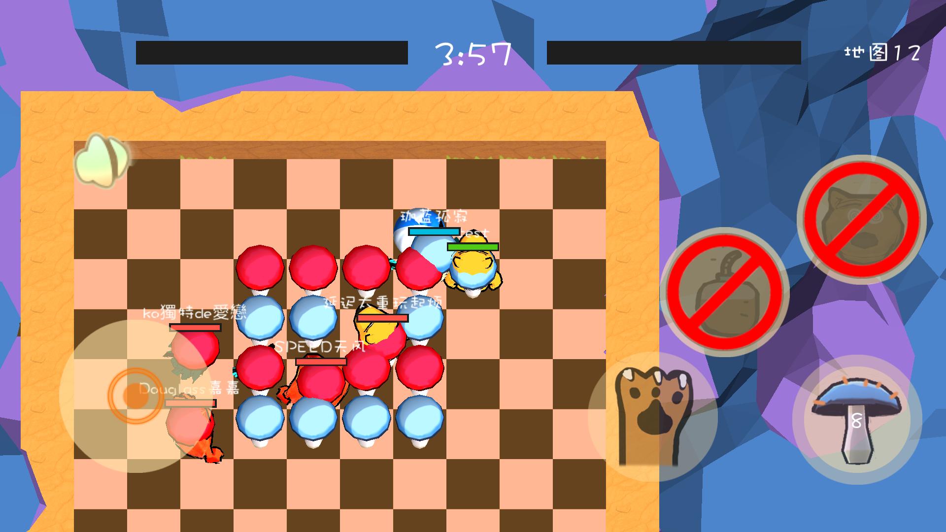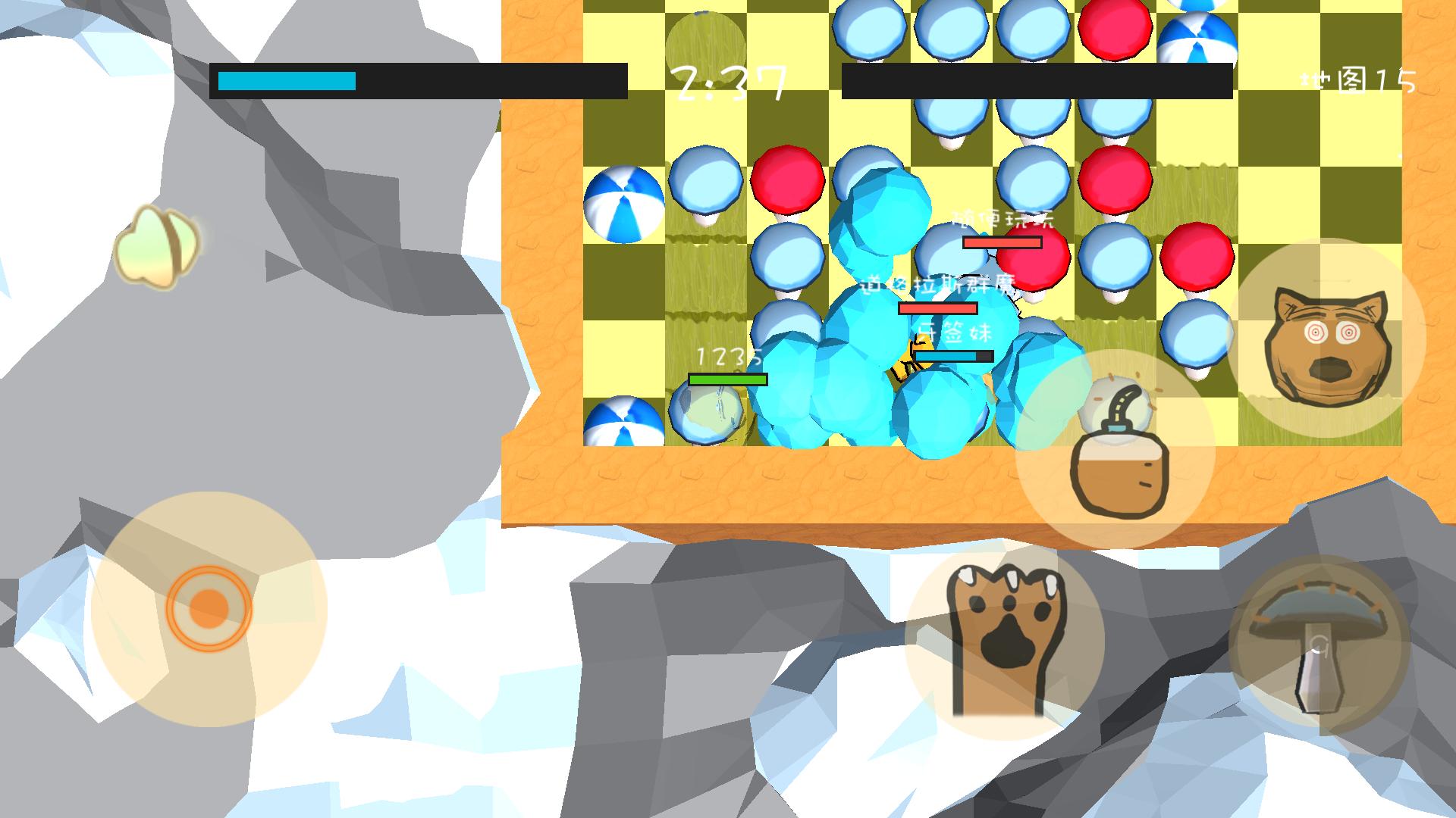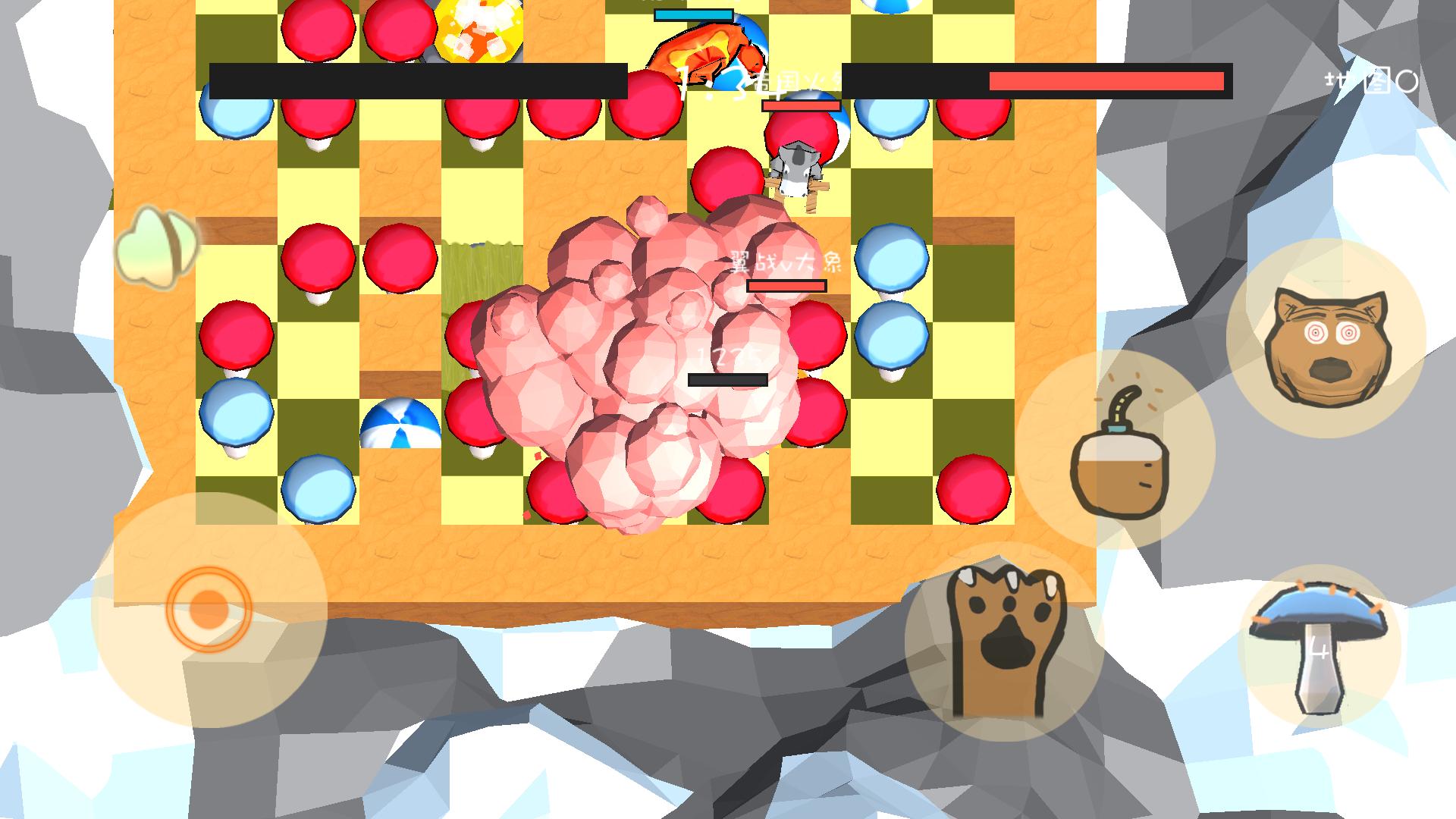 ¿Cómo obtener el puntaje? Use los hongos azules para encerrar los hongos rojos explotarán y los hongos rojos explosivos se convertirán en puntos (puede usar la roca, el borde del mapa, el árbol, la bola)