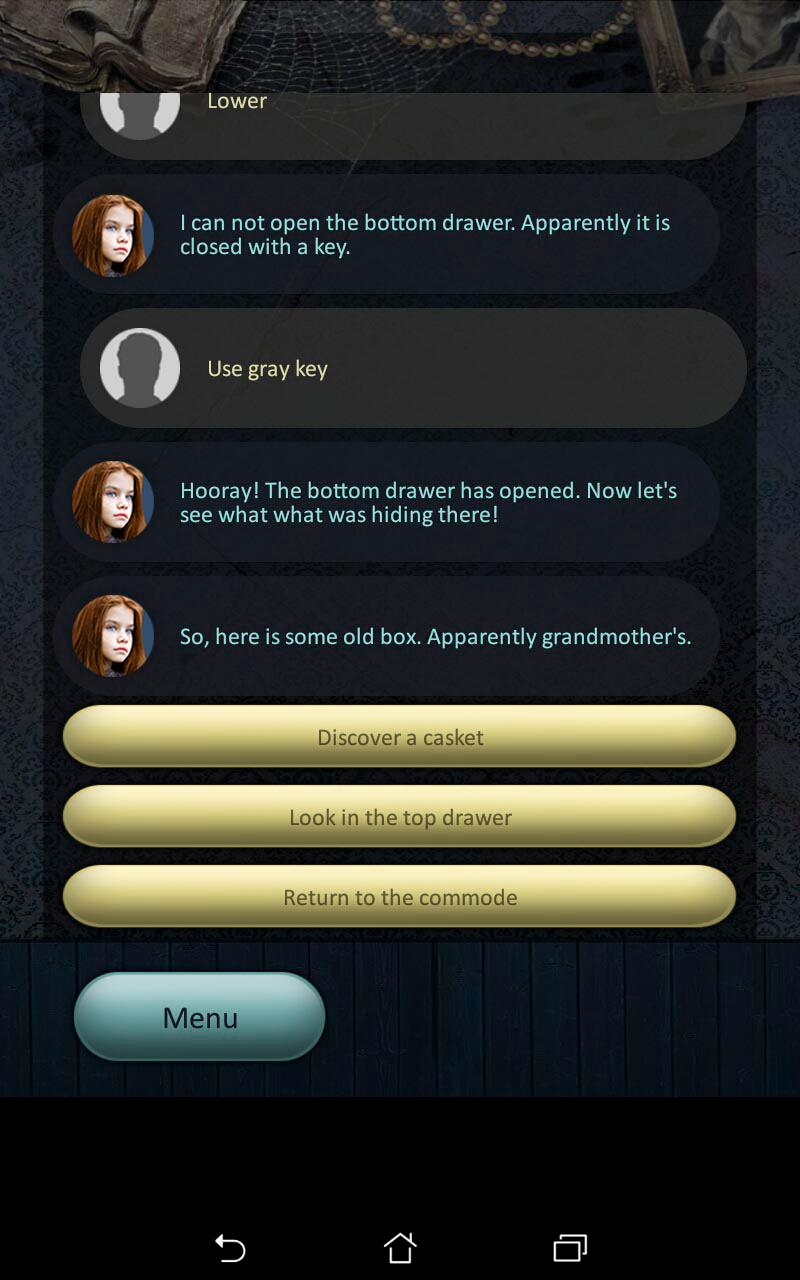 Escape the Room es un juego de búsqueda de texto: ¡resuelva acertijos y rompecabezas mental y busque la salida de la habitación mística cerrada para ayudar al héroe a escapar de un lugar espeluznante! Escapar de un espacio de prisión! Kate llegó a su abuela el fin de semana, pero toda su familia desapareció místicamente por la noche, ¡se despertó en la extraña habitación oscura con la puerta cerrada! ¡Ayúdala a huir de este lugar espeluznante! ¡Encuentra y usa artículos para salir y escapar! ¡Mira de cerca y guarda a Kate!