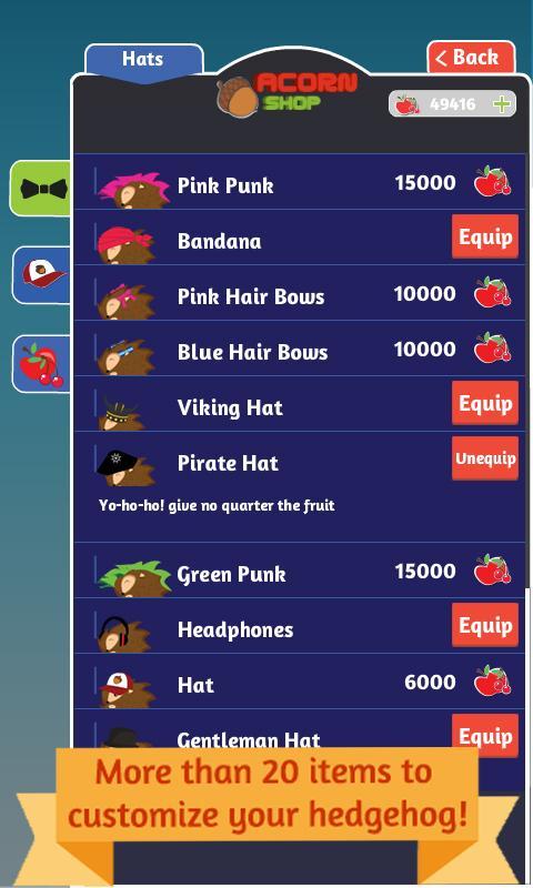 ¡Gráficos impresionantes, un nivel impresionante de detalles, excelentes formas agradables de personalizar el erizo, volverse social, comparar sus puntajes de erizo con sus amigos, 5 tipos de bonificación, jugar la rueda y recolectar otro tipo de bonificación!