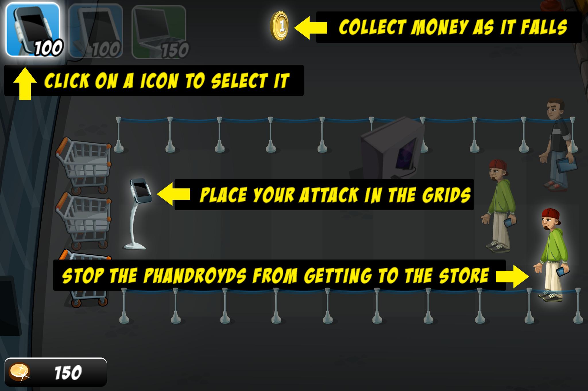 Da un paseo por el lado de los fanboys por una vez y defiende las tiendas, mientras atacan a primera vez cuando la tienda abre, lucha contra ellos usando algunos de los mejores dispositivos que tienes que entregar y enviarlos a los fandroides de regreso a casa para pensar en su ataque. Cree sus propias tiendas de aplicaciones, para ayudar a generar más efectivo para abastecerse de más de los últimos dispositivos.