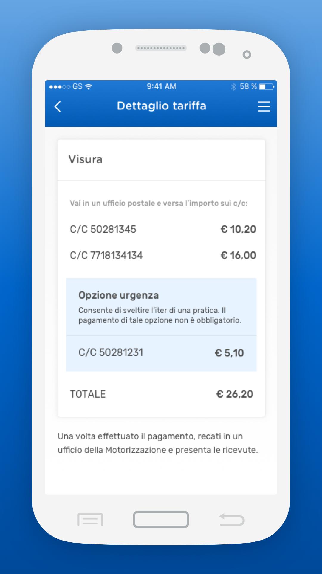 - Tarifa: lista de todas las prácticas automovilísticas bajo la competencia del departamento de transporte (motorización civil). Para cada práctica, se indican las cuentas corrientes postales sobre las cuales hacer pagos y los montos relacionados.