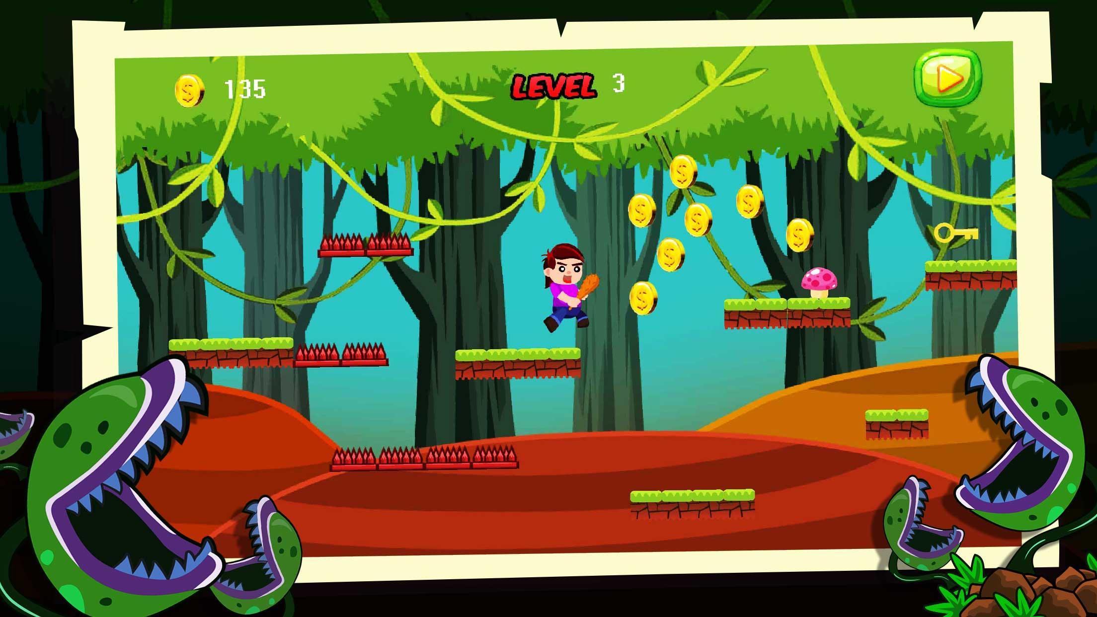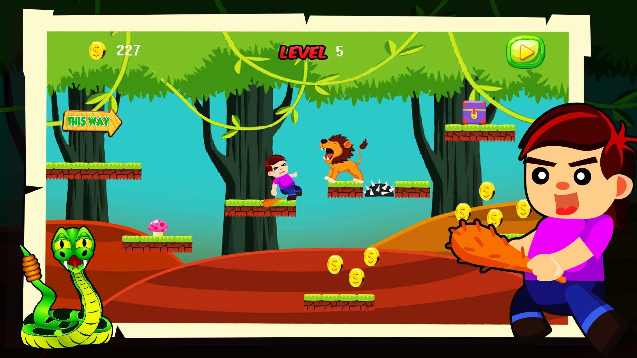 Jungle Adventure es un juego súper divertido y fácil de correr. Es un juego de acción adictivo y estimulante para desafiarse a sí mismo. Ayude a un niño a correr y alejarse de la jungla perdida. Escape de los obstáculos en el camino, golpee tanto como las monedas de oro para obtener puntaje. Se dará un honor de puntaje alto cada vez que su nuevo récord de puntaje. Este juego de aventura en la jungla te brindará una increíble experiencia de aventura con sus excelentes gráficos, concepto simple y controles fáciles en pantalla.