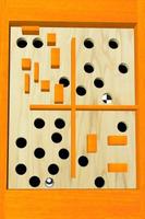 Incline el laberinto para mover la pelota al orificio de acabado. Evite los agujeros y otros obstáculos de madera y robe.