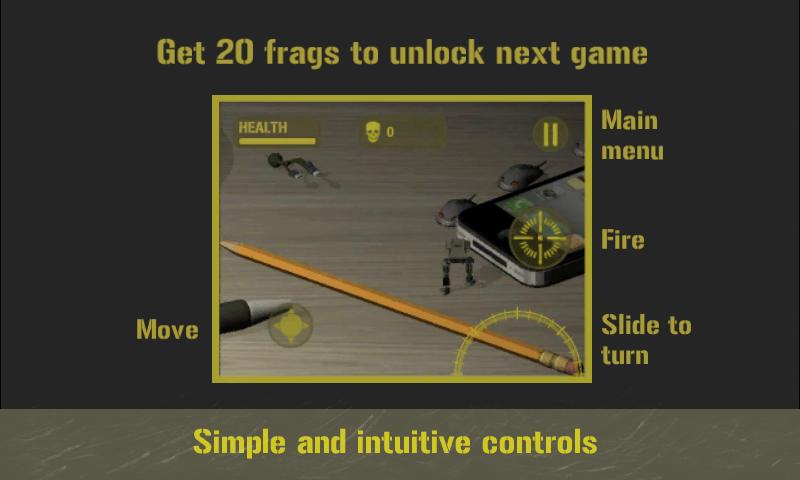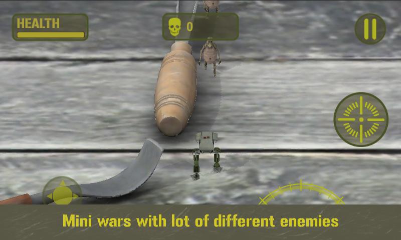 El mini ejército te llame. El mini ejército contiene 10 niveles de infinito de guerra pura, sangre, sangre y enemigos y criaturas. Llame a los mejores soldados y comience la guerra. Durante el nivel de infinito tienes que dispararles y sobrevivir. No hay necesidad de llamar ayuda. Elija su soldado del Arsenal - Mini Soldado con Arsenal de Rifles, Robot Mech con Arsenal de Máquinas Pistolas y Armadas o Archer Elfa con Submarina Uzi.