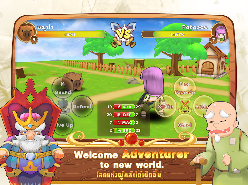Eres el héroe convocado por el rey. El rey te pide que pelees con el diablo que arruina el reino de Pakapow en este momento.