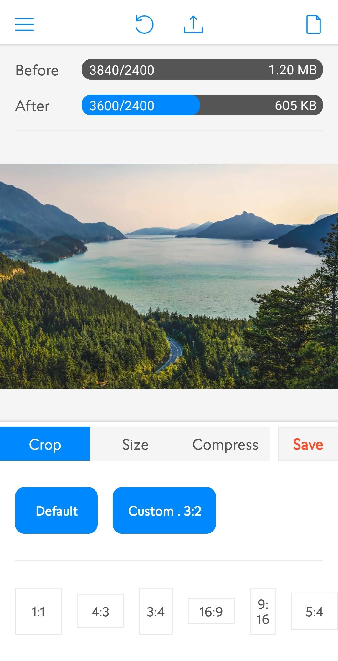 Photo Resize proporciona una función de cultivo, use la función de cultivo para eliminar las partes no deseadas de la imagen y elegir entre las muchas relaciones de aspecto disponibles para ajustar mejor la foto.