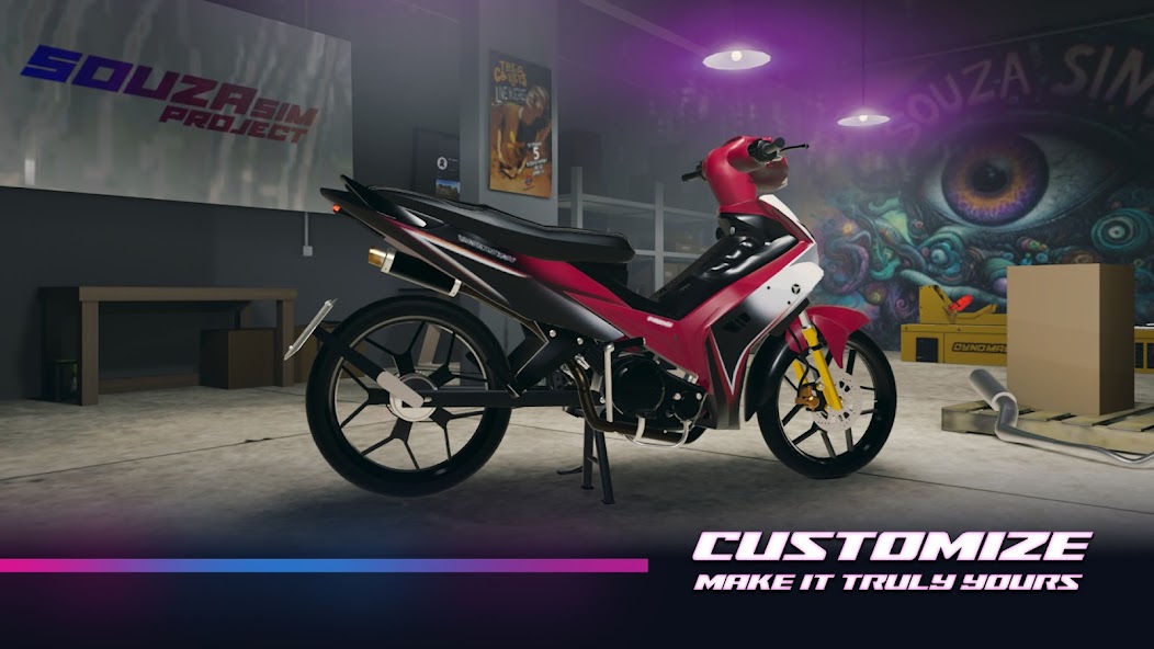 Souzasim tiene que ver con la sintonización: cambie el escape, las llantas, los faros, baje la bicicleta configurando la suspensión y mucho más. Casi cada parte de su bicicleta es personalizable. También puede elegir el color de las piezas para adaptarse a su estilo.