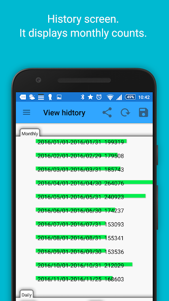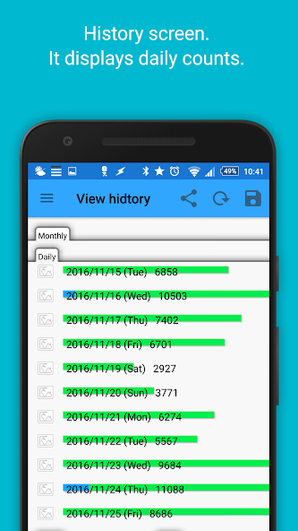 La mitad en la pantalla para mostrar la buena cantidad de pasos, el primer número total de pasos en el día, la mitad inferior de la pantalla. Si toca cualquier día de la mitad en la pantalla y se muestra en la mitad inferior del pequeño número de pasos ese día.