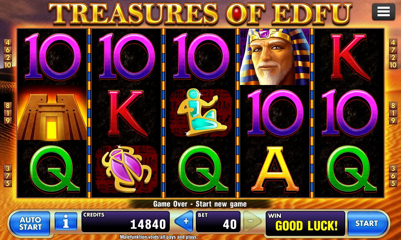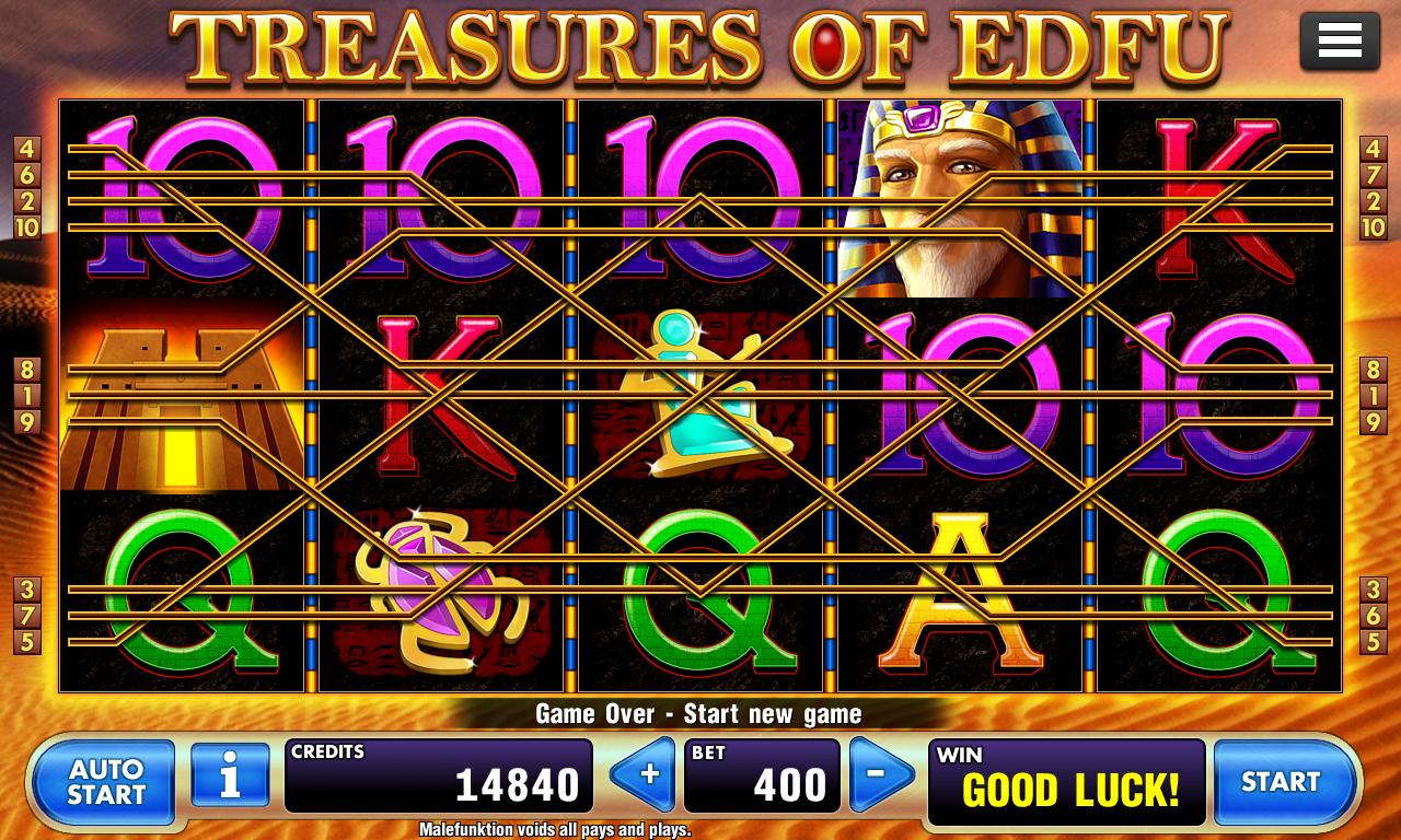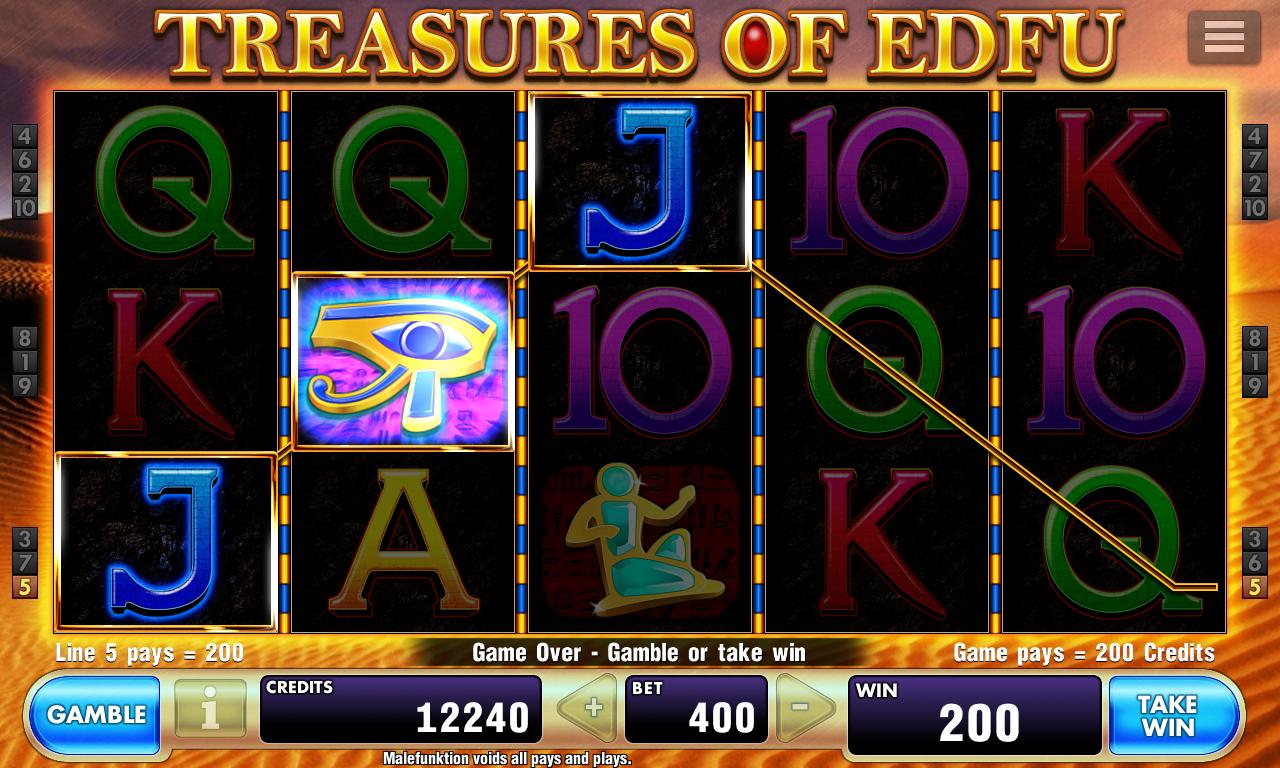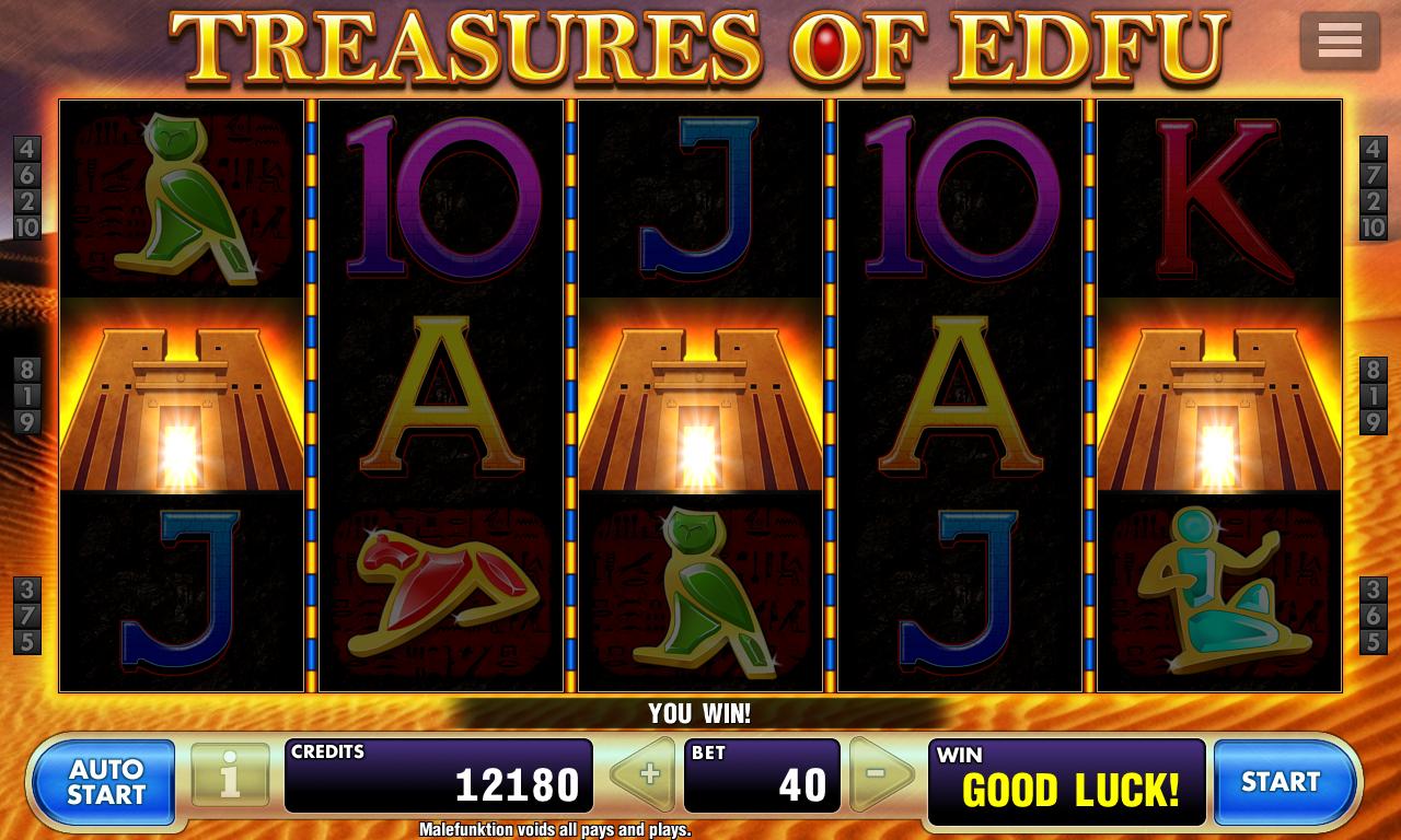 Las misteriosas pirámides abrirán las puertas a sus cámaras del tesoro en Treasures of Edfu ™. 5 carretes con un total de 10 líneas de victorias revelarán jeroglíficos y reliquias de un tiempo perdido. El "Eye of RA" te ayudará a completar los desconcertantes personajes.