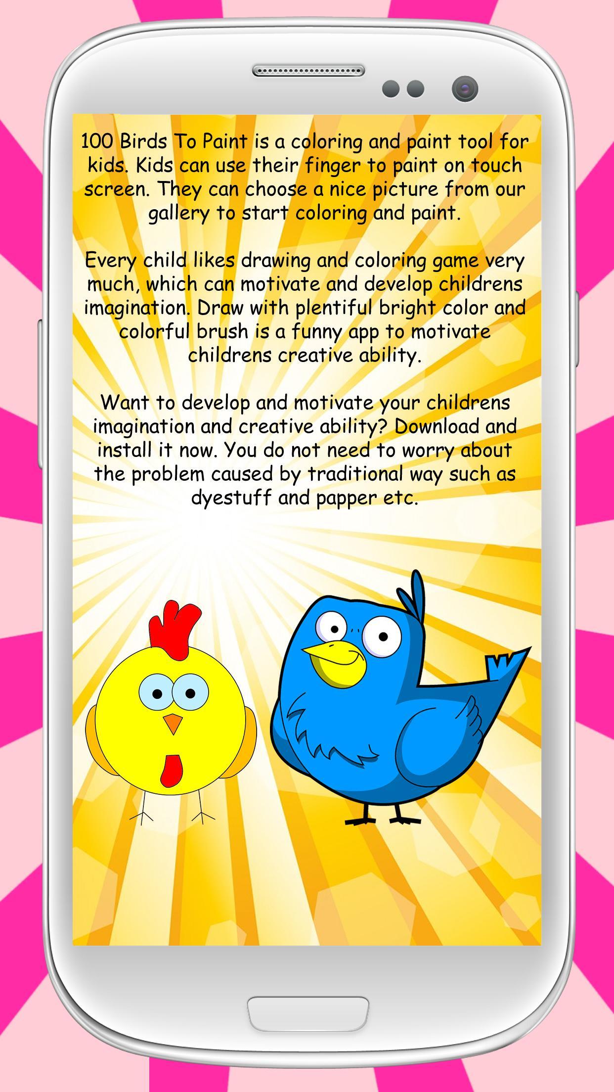 100 Birds To Paint est un outil de coloration pour les enfants. Les enfants peuvent utiliser ses doigts ou un stylo léger pour colorer sur l'écran tactile de sa tablette ou un téléphone intelligent. A une large galerie où il peut y avoir une grande quantité d'images à colorer ainsi que des centaines de couleurs disponibles dans notre palette.