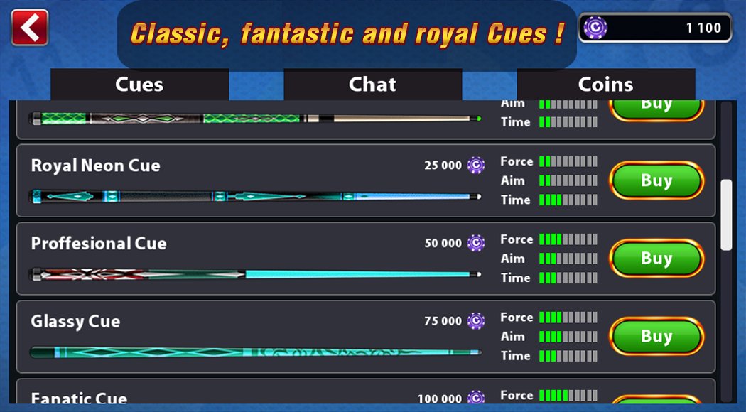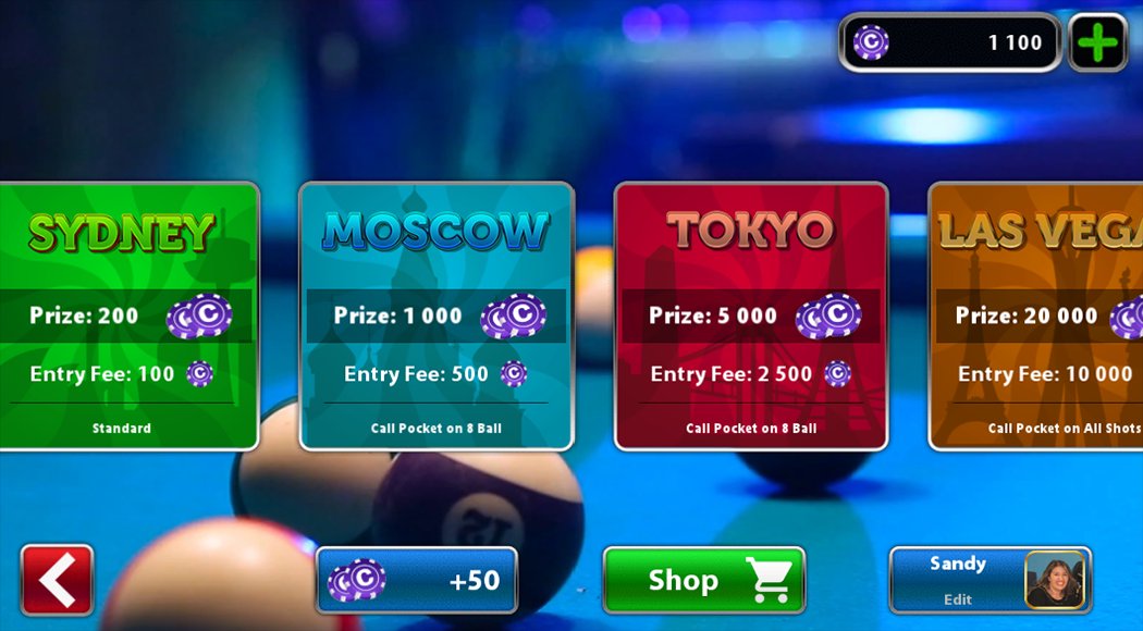 Jouez en ligne et gagnez des pièces et des trophées, vous pouvez personnaliser votre queue et jouer dans 8 salles différentes.