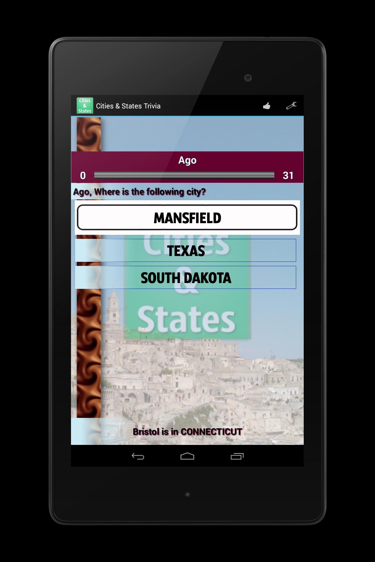 Application Trivia: Associer la ville à la province, à la région ou à l'État correspondant.