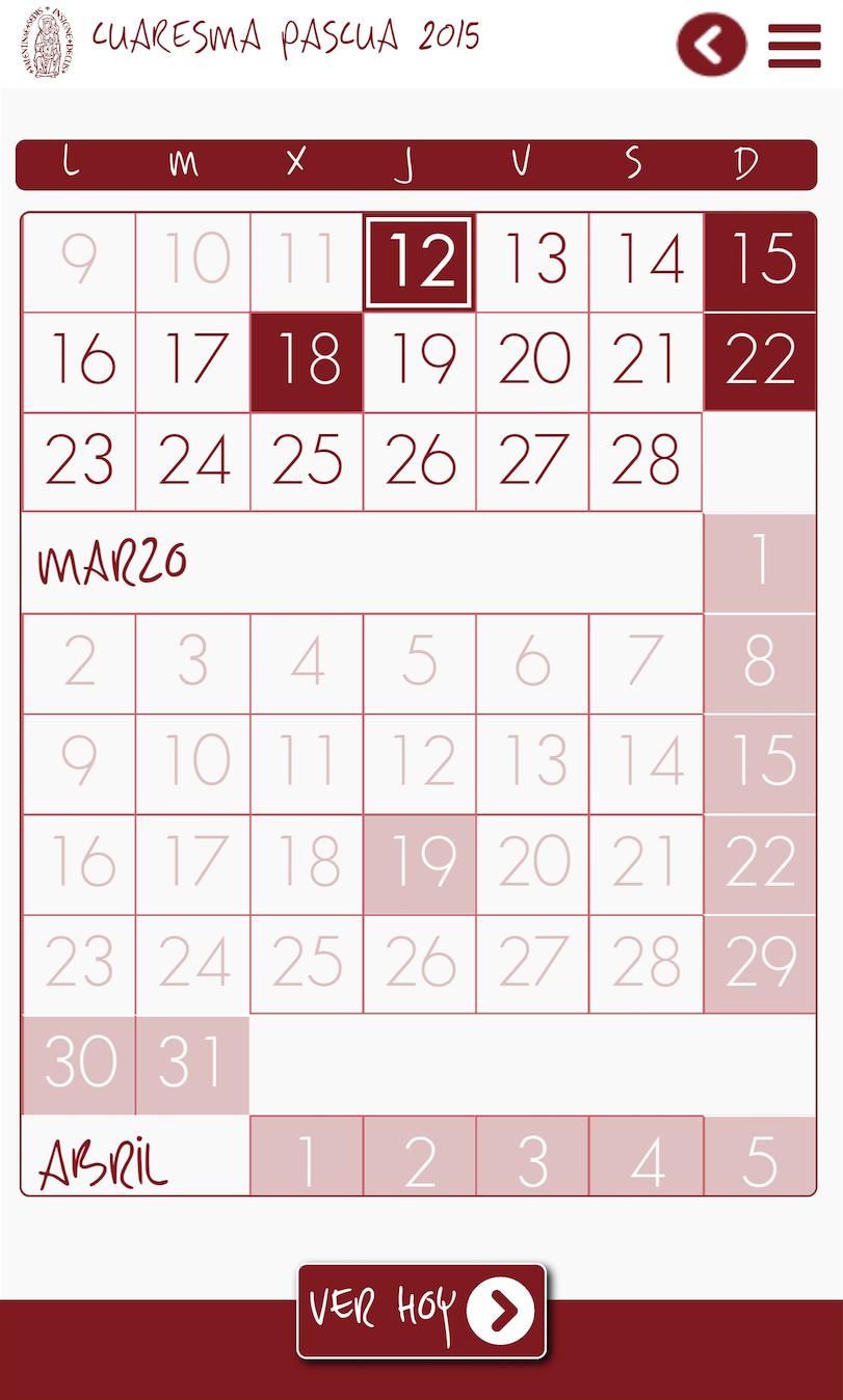 L'application de Carême de Pâques permet une surveillance quotidienne du Carême et des Pâques et des jours les plus importants de la semaine sainte comme le mercredi des cendres, Domingo de Ramos, El Triduo Sacro, Domingo de Resurreción, la Fiesta de la Divina Misericordia et le dimanche de Pentecost, en plus des festivités de San José (19), San Ventente Ferrer (avril 13), The Virgin of the Forsak (10 mai) et l'ascension du Seigneur (17 mai).
