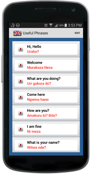Une méthode rapide et simple pour apprendre le kinyarwanda. Dans cette application, vous avez eu accès aux leçons traduites de l'anglais en Kinyarwanda avec des mots audio et des mots clés. Ensuite, vous avez accès à des questions et des réponses qui vous aideront à apprendre rapidement à apprendre le vocabulaire de plusieurs mots kinyarwanda. Une série d'images est également fournie pour vous aider à apprendre le kinyarwanda de l'anglais.