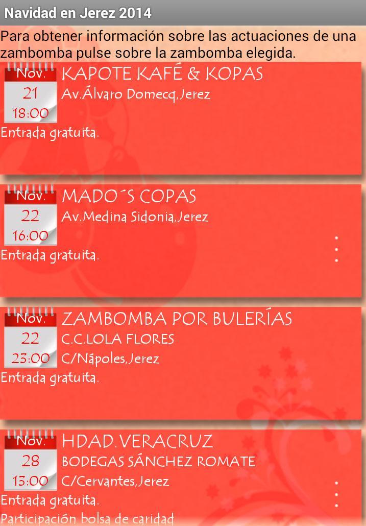 Connaissez les Zambas de Noël qu'il y a tous les jours dans votre ville et les prochains qui sont prévus, connaissez le lieu de célébration ainsi que les groupes qui agissent dans chacun des Zambombas. Vous pouvez rechercher des zambombas autour de votre position actuelle (GPS) pour savoir quels zambombas il y a près.