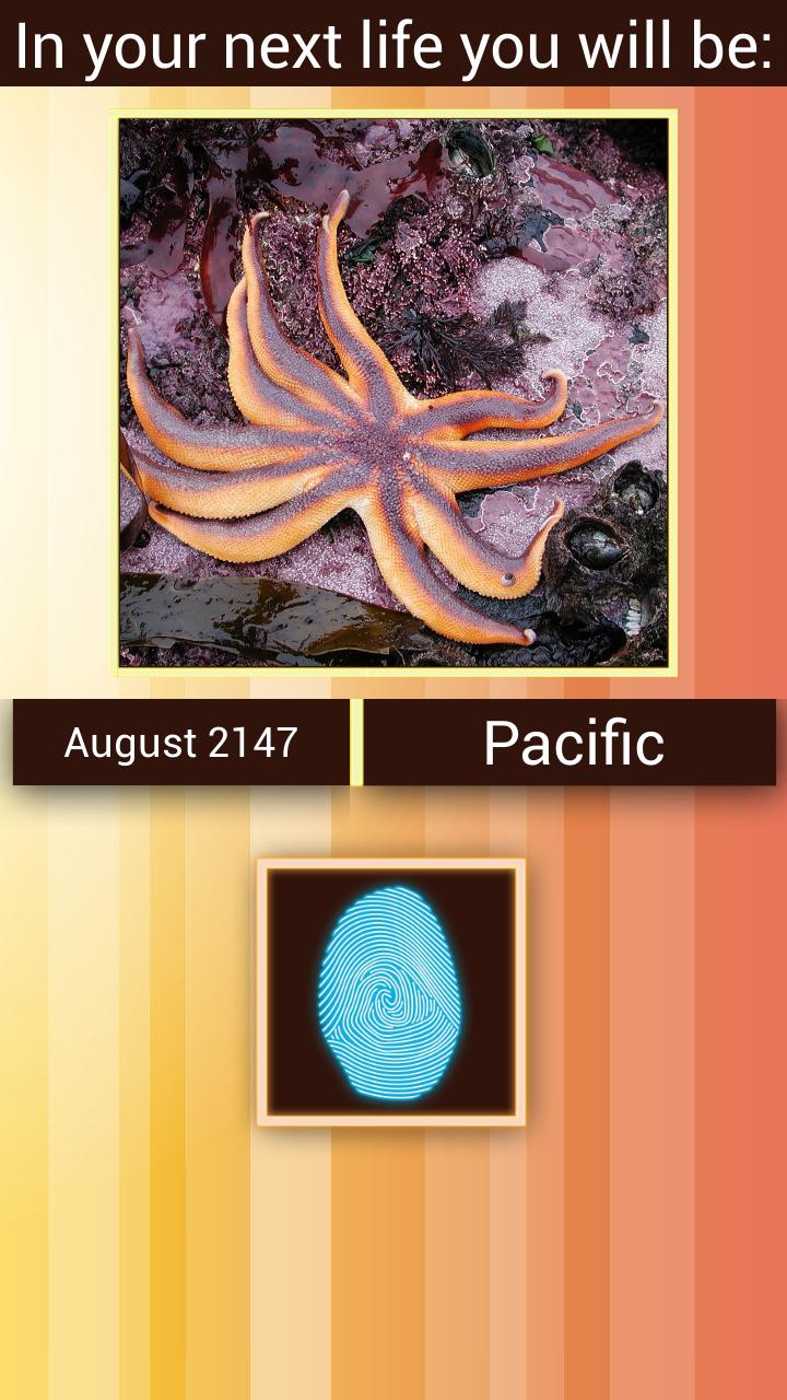 Mettez simplement votre doigt sur le point de balayage et attendez. En 5 secondes après une analyse sérieuse, vous saurez qui vous serez dans la prochaine vie! Seules les méthodes scientifiques spéciales utilisées. Si vous voulez tout savoir dès maintenant, scannez simplement votre doigt dès maintenant. Demandez à vos amis de le faire également et obtenez un résultat drôle sur leur avenir! Se moquez avec vos amis car ils peuvent naître comme un animal ou même une plante!