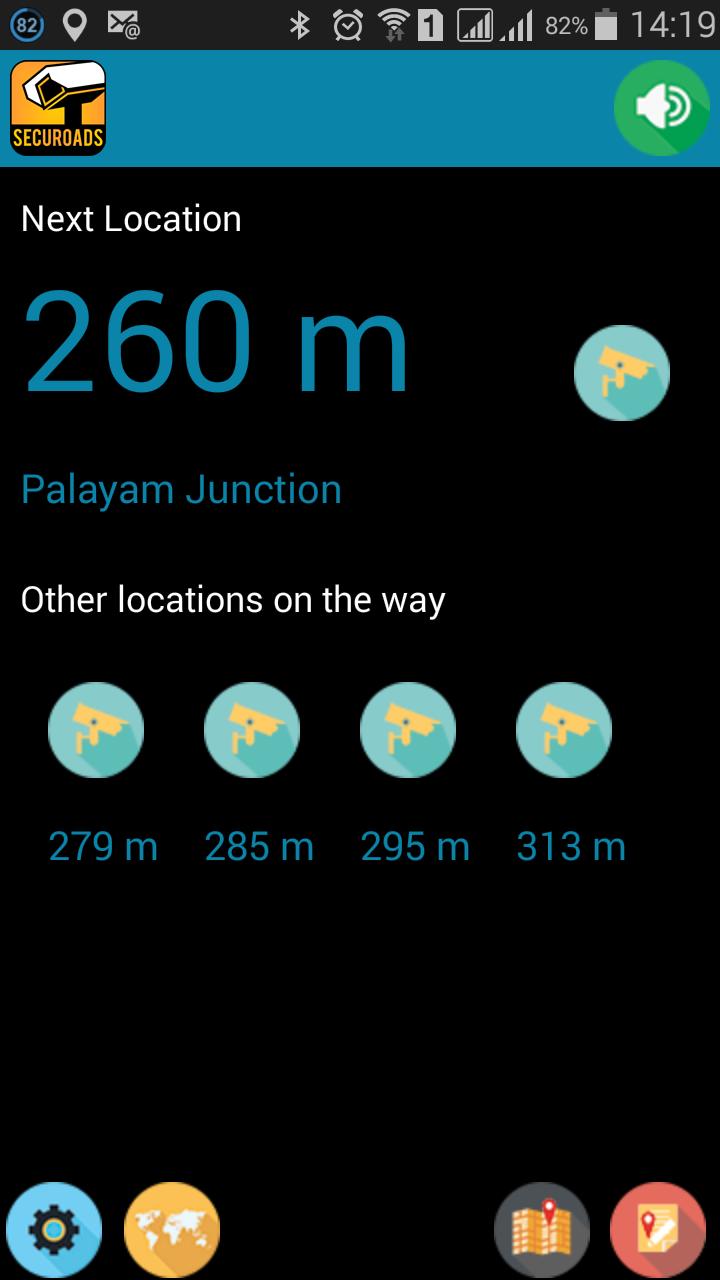 Version gratuite de Securoads. Met en garde contre les pièges (caméra de vitesse, caméra de surveillance, bosse, virage net, etc.) sur les routes du Kerala (Inde).