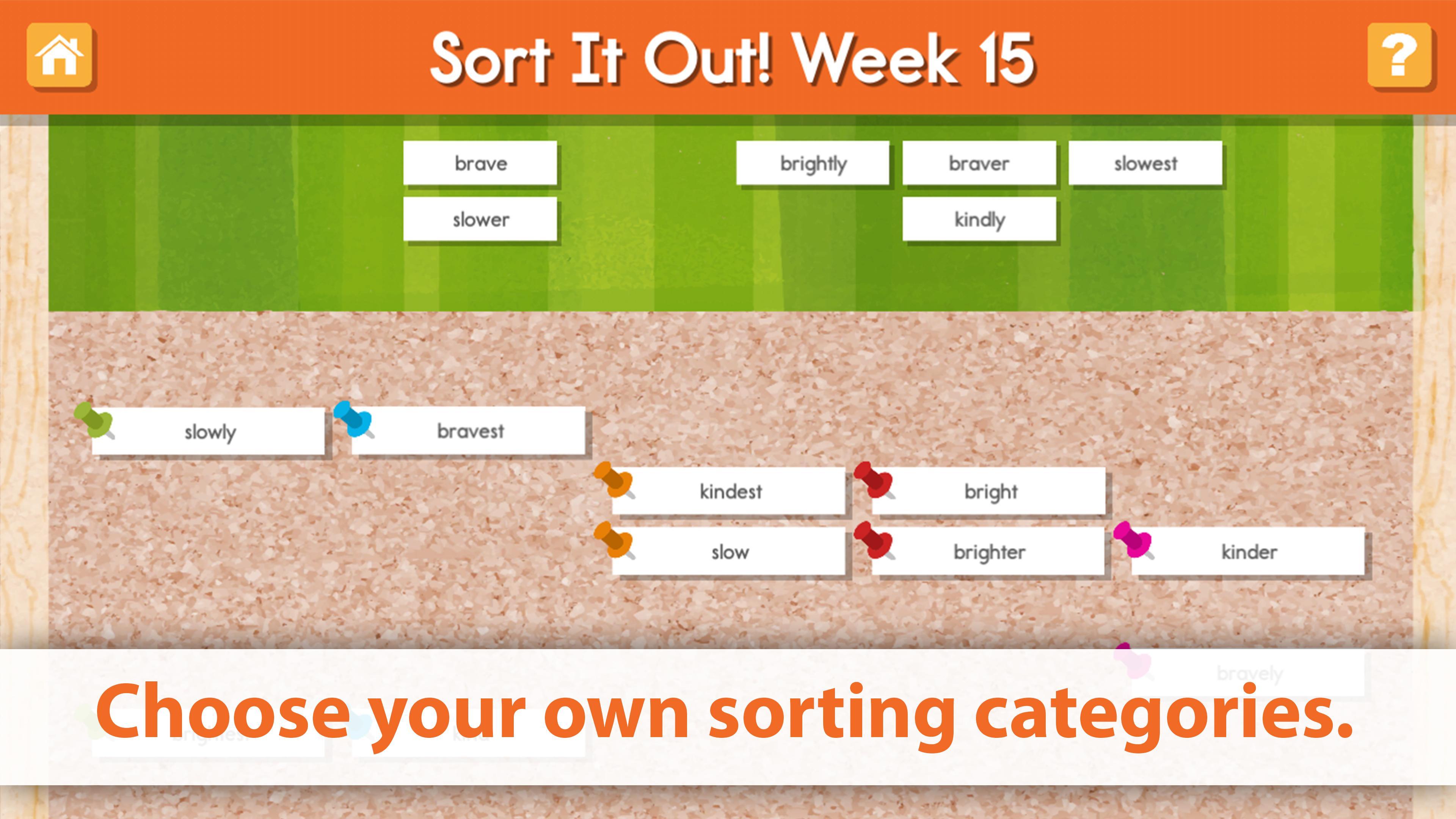 En construisant ce mot!, Les enfants entendent un mot, puis assemblent le mot en commandant des lettres ou des groupes de lettres. En trier!, Les enfants catégorisent des mots en fonction de l'orthographe, du son ou d'autres attributs. Les deux jeux incluent des animations amusantes à mesure que les enfants progressent à travers les jeux.