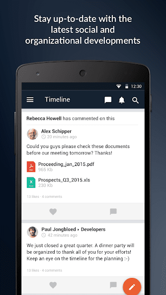Partagez rapidement et facilement de nouvelles connaissances, idées et réalisations internes avec le reste de votre équipe, département ou organisation. Enrichir les messages avec des photos, des vidéos et des émoticônes. Gardez simplement une trace de nouveaux articles de vos collègues, organisations et partenaires.