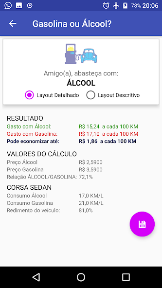 You enter the price per liter of alcohol AND / OR the gasoline and the application calculates which fuel is more advantageous at the pump.