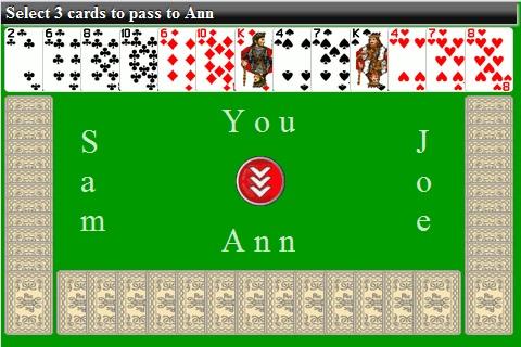 At the beginning of round, the players choose three cards to pass to a random player. The player with the 2 of clubs must lead the first trick with the 2 of clubs. For each trick a player must follow suit unless he does not have a card of that suit. Because there is no trump, a player can not win a trick if he passes a card of any suit other than the suit lead. Hearts can not be lead until hearts are broken - after the first heart card has been played. If a player takes every point in a round, he “Shoots the Moon” and he receives 0 points for the round while all other players receive 26 points.